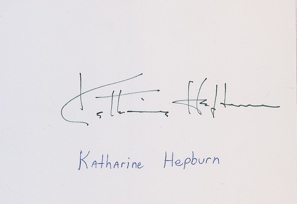Felt tip signature, “Katharine Hepburn,” on a white 6.75 x 4.75 sheet, with a collector’s notation written beneath her signature. In fine condition, with a central vertical fold. The notation could be easily matted out, if so desired.