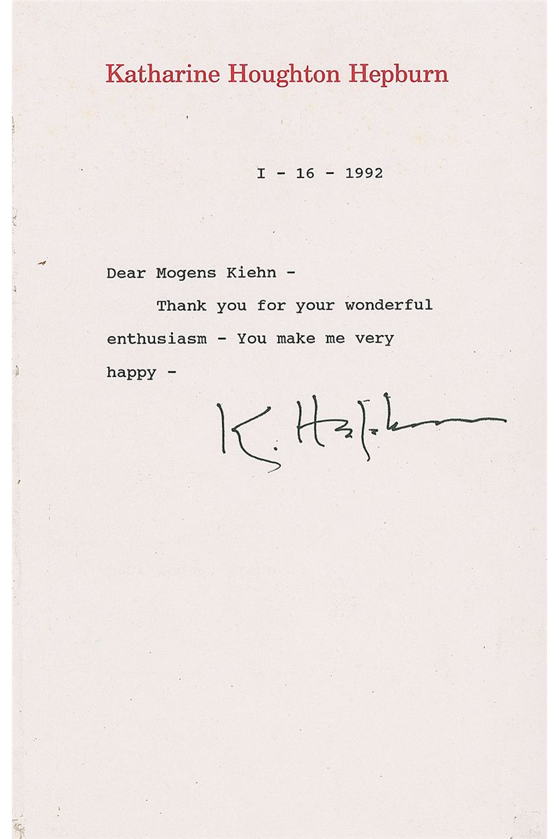 TLS signed “K. Hepburn,” one page, 5.5 x 8.5, personal letterhead, January 16, 1992. In full: “Thank you for your wonderful enthusiasm—you make me very happy.” In fine condition, with a central horizontal fold passing through signature.
