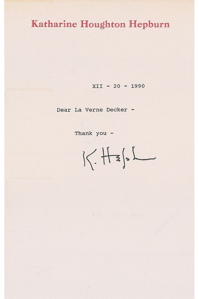TLS signed “K. Hepburn,” one page, 5.5 x 8.5, personal letterhead, December 20, 1990. Brief response to an admirer. In full: “Thank you.” In fine condition.