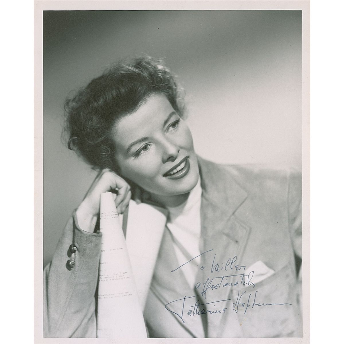 Uncommon matte-finish 8 x 10 photo of Hepburn with a script in her right hand, signed and inscribed in black ballpoint, “To Miller, affectionately, Katherine Hepburn.” In fine condition, with some mild rippling along bottom edge, and a light crease to background, slightly touching the forehead area. Hepburn was well-known for her reluctance to sign photographs for anyone but friends and professional acquaintances.