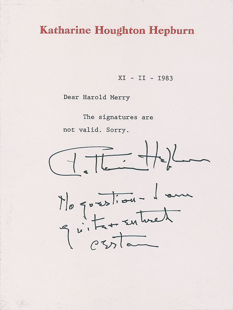 TLS, one page, 6 x 8, personal letterhead, November 2, 1983. Response to a skeptical autograph collector. In full: “The signatures are not valid. Sorry.” In her own hand below, Hepburn adds, “The question—I am quite & entirely certain.” In very fine condition.