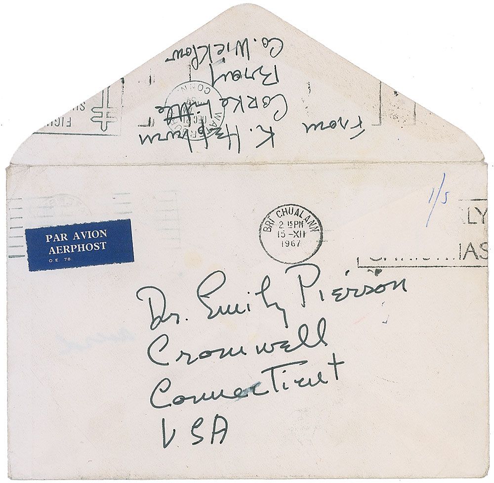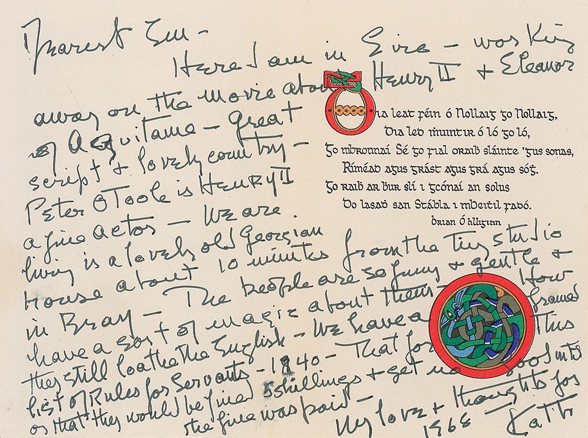 ALS signed “Kath,” two pages both sides, 4 x 6, December 15, 1967. Letter to her friend Emily Pierson. In part: “Here I am in Eire—working away on the movie about Henry II & Eleanor of Aquitaine—great script & lovely country—Peter O’Toole is Henry II a fine actor…The people are so funny & gentle & have a sort of magic about them—How they still loathe the English.” In fine condition. Accompanied by the original mailing envelope, addressed in Hepburn’s hand, and signed on the reverse in the return address area, “K. Hepburn.”