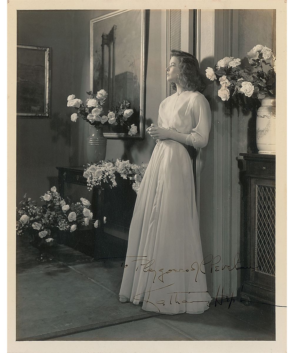 Vintage pearl-finish 8 x 10 Vandamm photo of Hepburn as she appeared in The Philadelphia Story, signed and inscribed in fountain pen, “To Playgoers of Cleveland, Katharine Hepburn.” Promotional caption affixed to the reverse describes Hepburn as “the harried divorcee in Philip Barry’s gay and charming comedy, ‘The Philadelphia Story.’” A few light bends, some scattered light silvering to darker areas of background, and some light contrast to last name of signature, otherwise fine condition.
