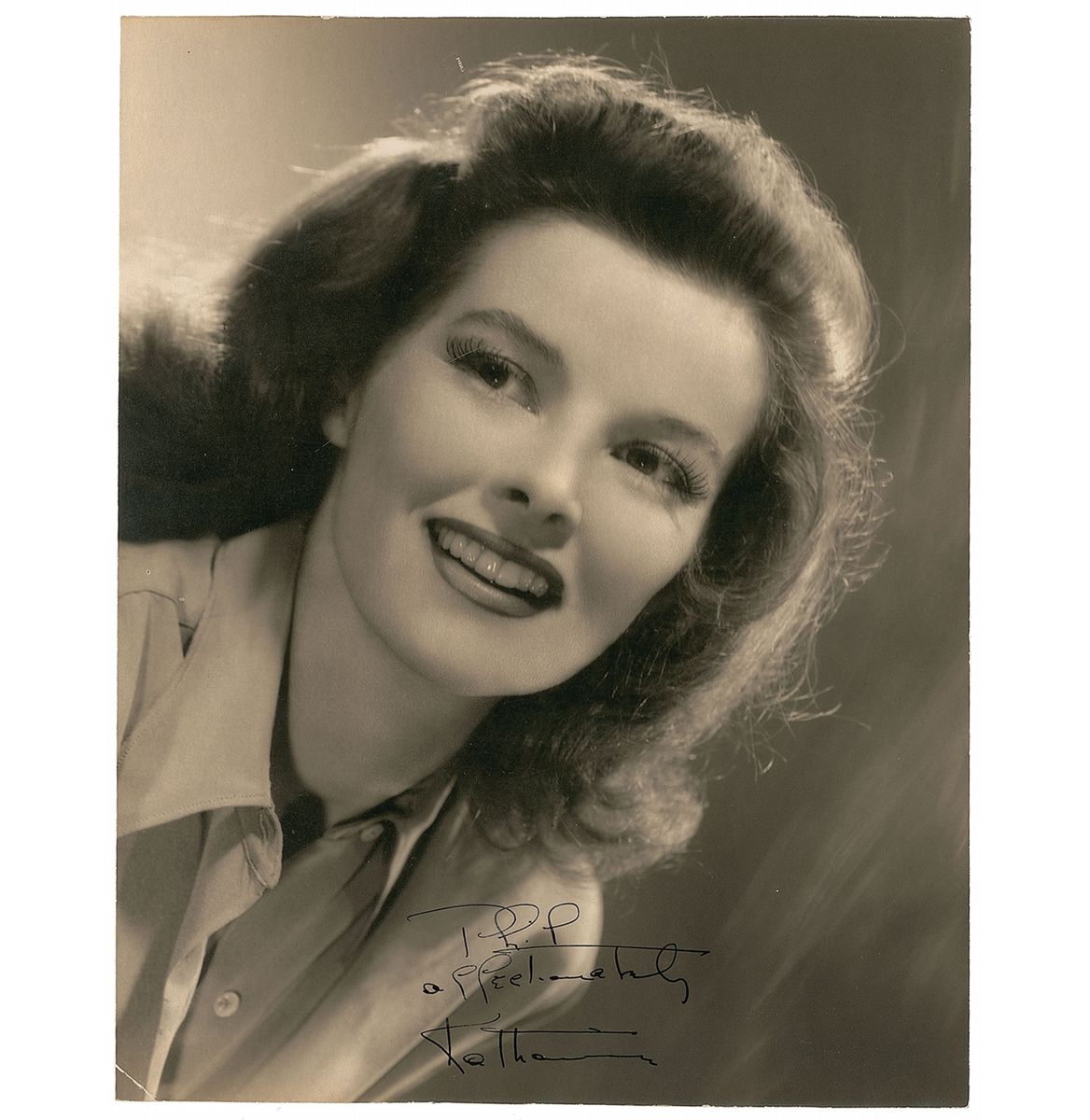 Vintage matte-finish 9.5 x 12 Clarence Sinclair Bull MGM publicity photo of a young and radiant-looking Hepburn, signed and inscribed in black ink, “Phil, affectionately, Katharine.” In fine condition, with slightly trimmed edges and a small crease to lower left corner tip. A scarce oversized offering capturing the actress’s youthful beauty.