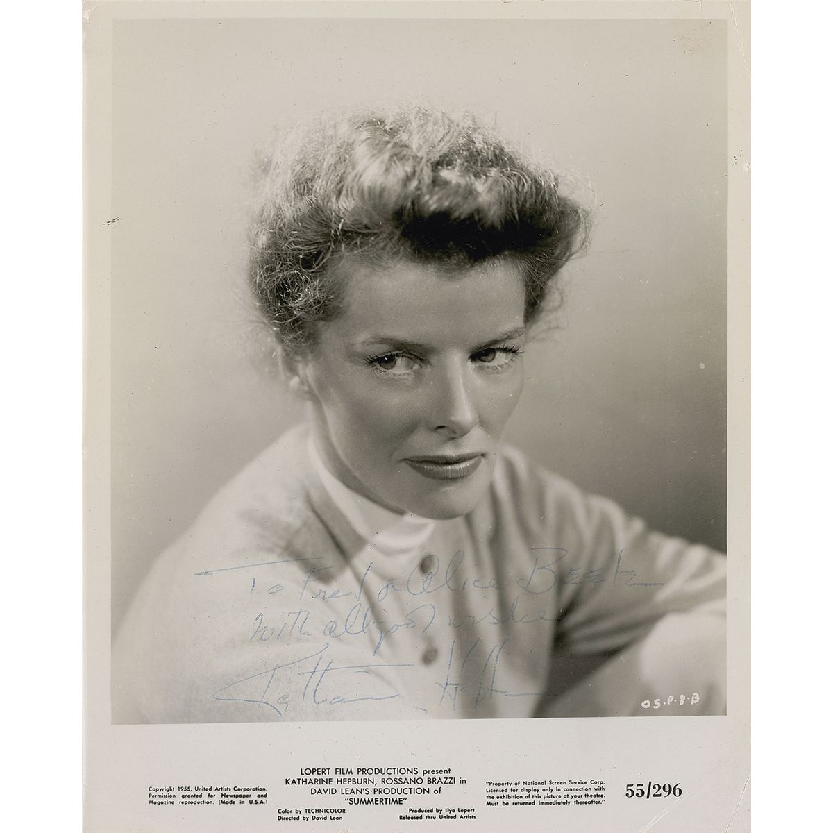 Uncommon vintage glossy 8 x 10 United Artists promotional photo for the 1955 film Summertime, signed and inscribed in blue ballpoint, “To Fred & Alice Beele, with all good wishes, Katharine Hepburn.” In very good condition, with scattered creases and surface marks, a few dings to top edge, and signature and inscription a couple of shades light, but still completely legible.