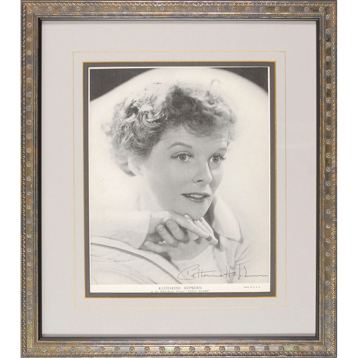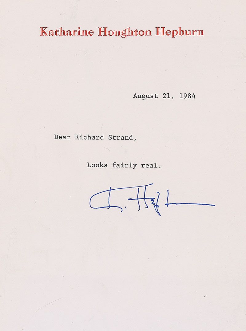 Scarce matte-finish 7.5 x 9.5 screened planographic print of Hepburn in her 1935 role as Alice Adams, signed in the lower right in black ink, attractively double-matted and framed with UV-protective glass to an overall size of 13 x 15; and a TLS sent to a previous owner of the photo, one page, 6 x 8, personal letterhead, August 21, 1984, responding to his question of whether or not the signed photo was genuine. In full: “Looks fairly real.” In overall fine condition. For her portrayal of Alice Adams, Hepburn received an Oscar nomination for Best Actress in a Leading Role. An unusual and interesting autographic pairing, as she was notably reluctant to sign photos for anyone but close friends and professional associates.
