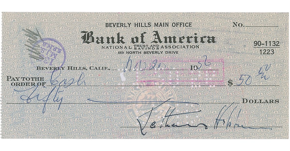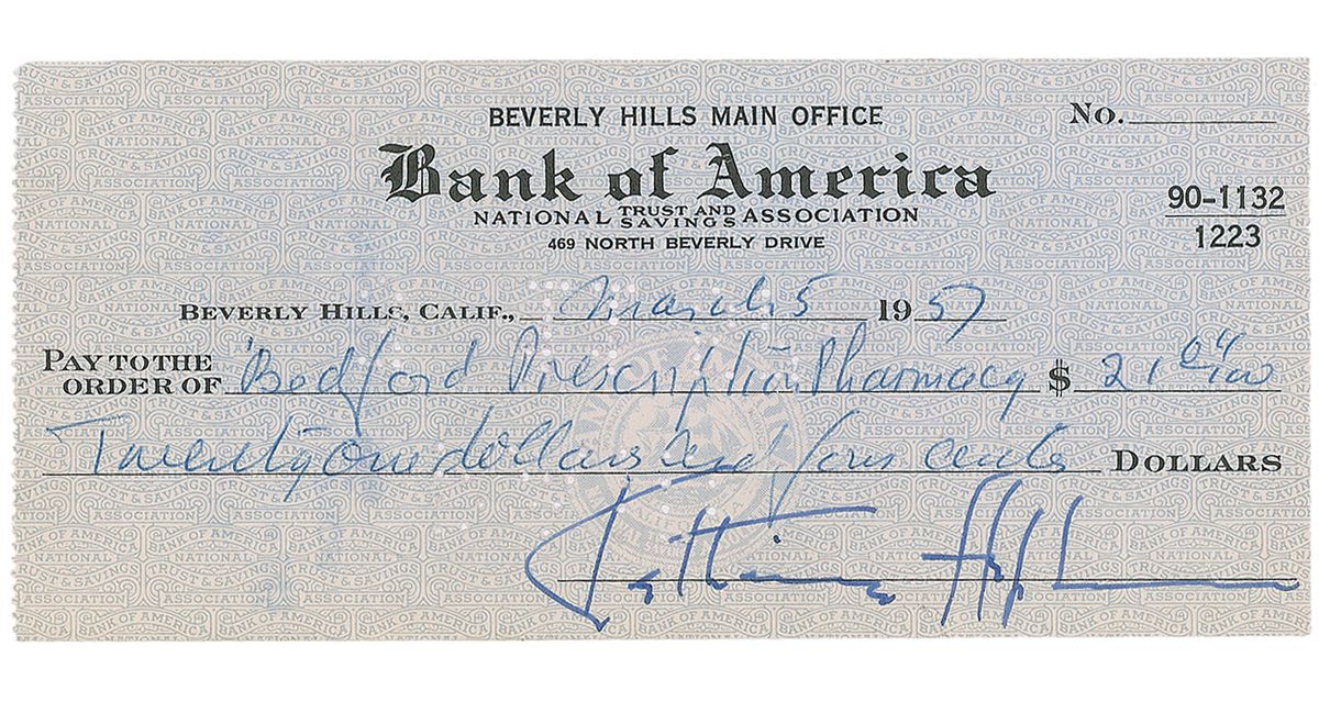 Two bank checks, 5.75 x 2.5, each filled out in another hand and signed by Hepburn, dated 1956 and 1957. In fine condition, with expected bank stamps and cancellation holes (slightly affecting portions of signatures).