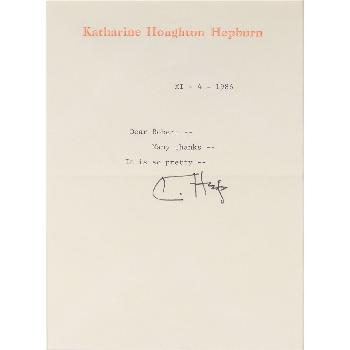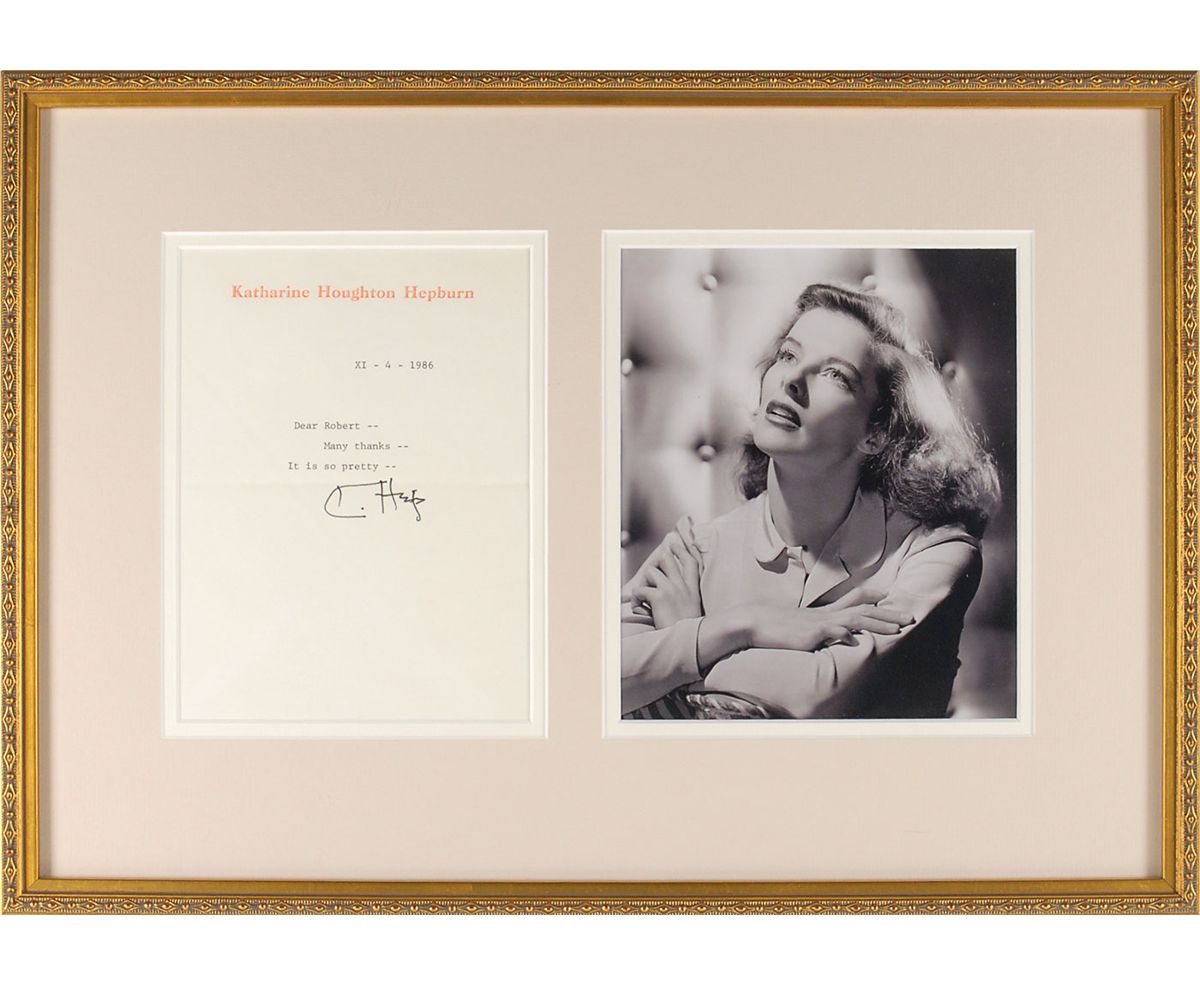 TLS signed “K. Hep,” one page, 5.75 x 7.75, personal letterhead, November 4, 1986. In full: “Many thanks—It is so pretty.” Attractively double-matted and framed with a portrait to an overall size of 19.5 x 14. In fine condition. Accompanied by the original mailing envelope.