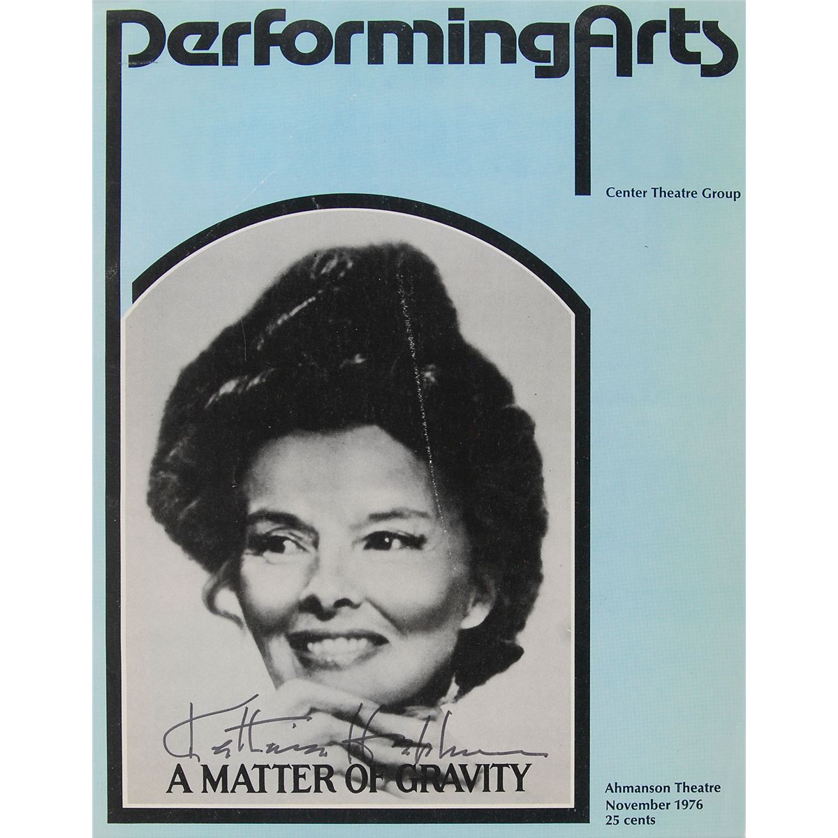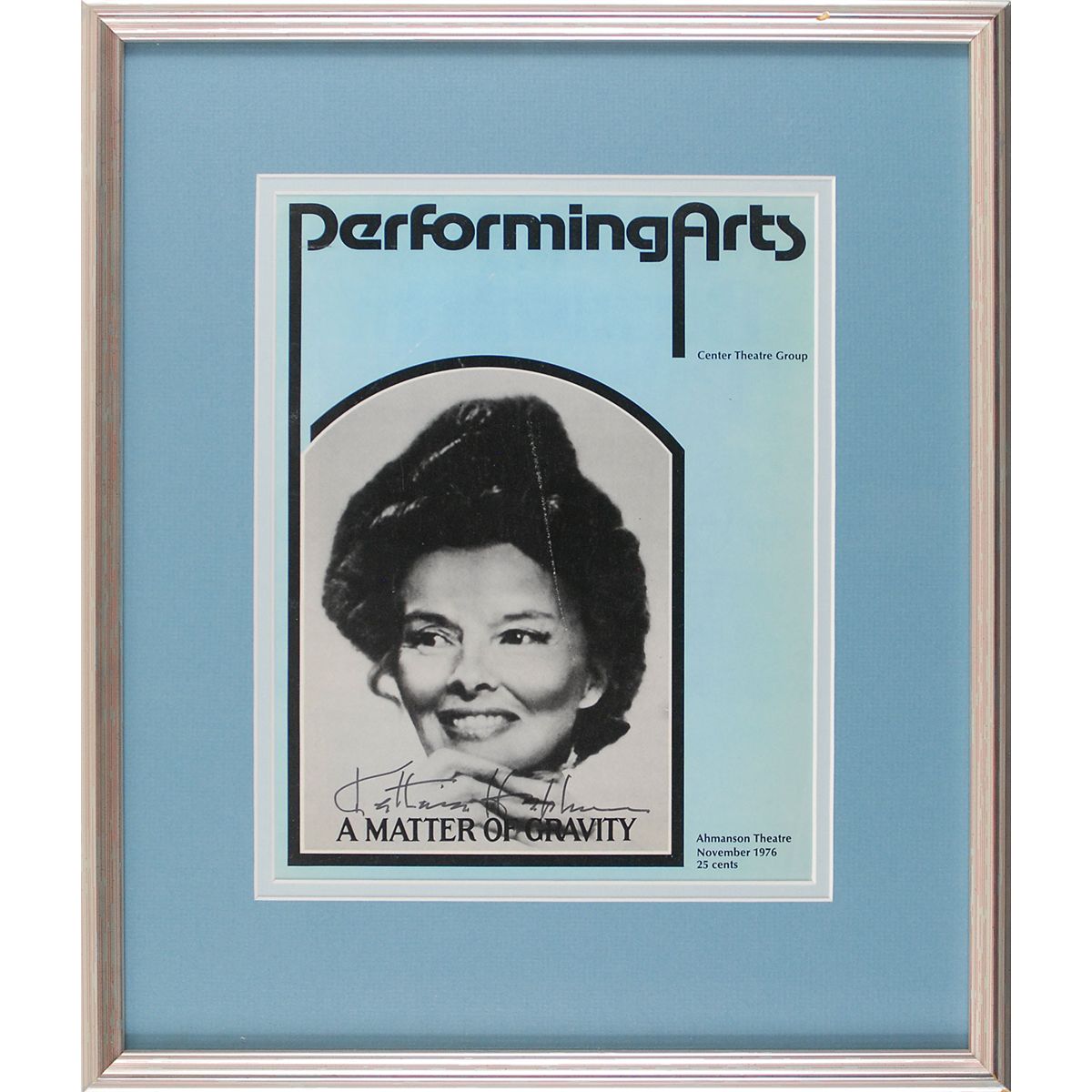 Program cover from A Matter of Gravity at the Ahmanson Theatre, November 1976, 8 x 10.25, signed across her portrait in black felt tip. Double-matted and framed to an overall size of 14 x 16.5. In very good condition, with noticeable scattered marks and creases. An uncommon format for Hepburn, who only hesitantly signed images of herself.
