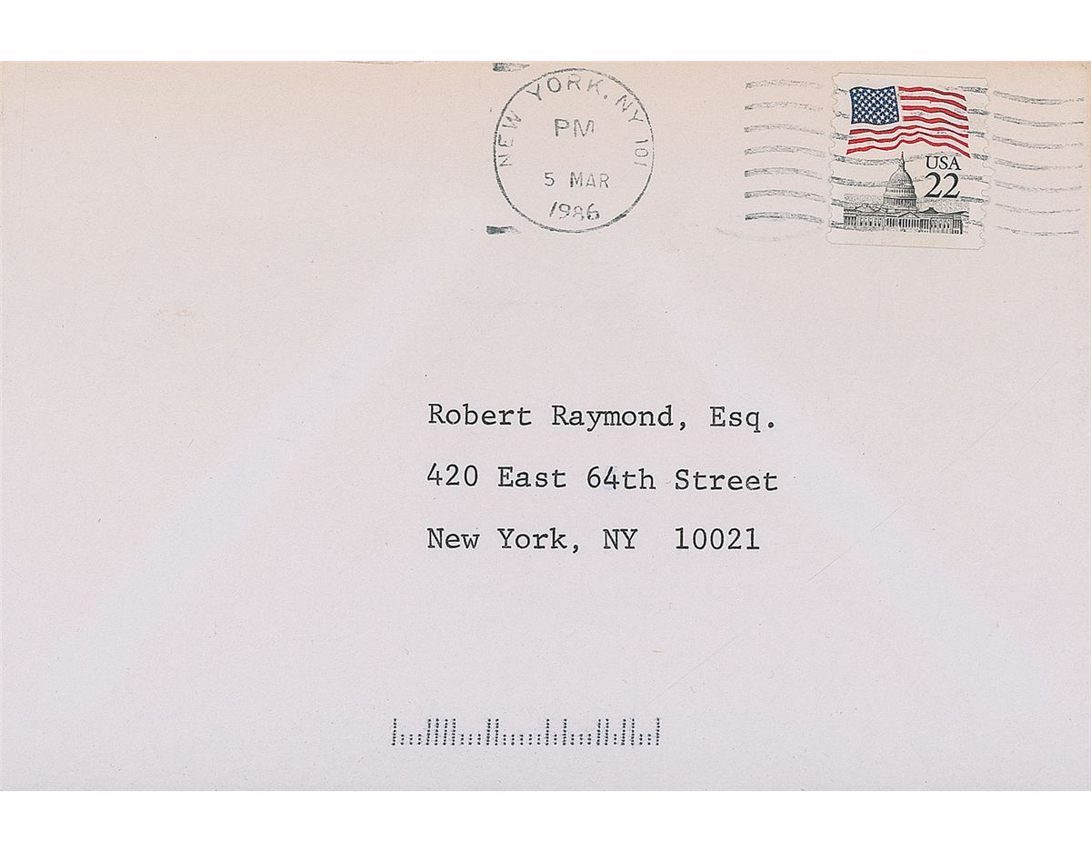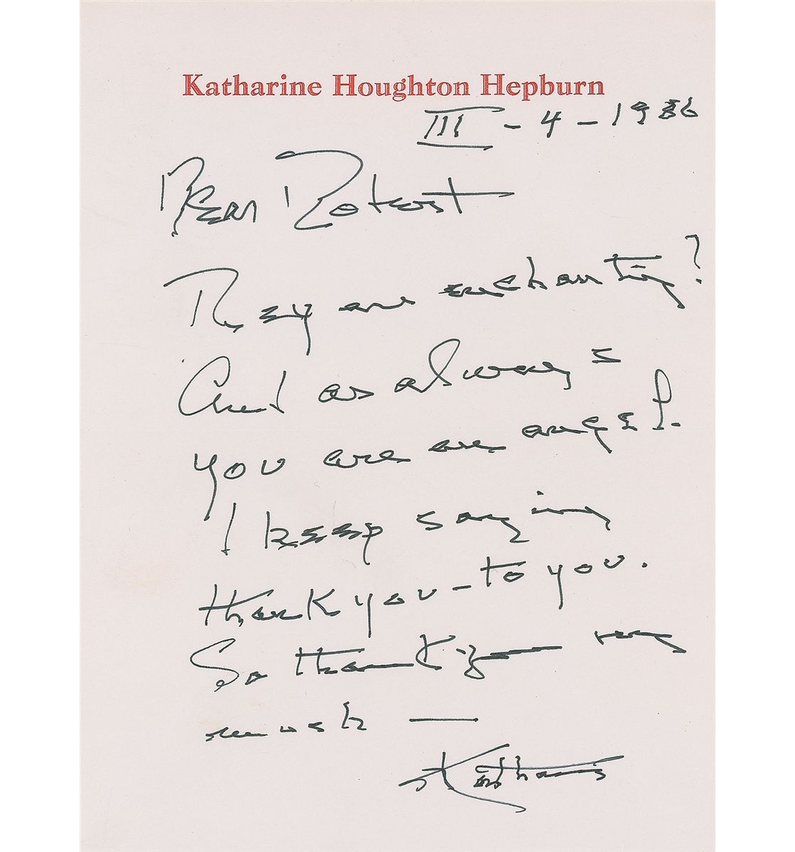 ALS signed “Katharine,” one page, 6 x 8, personal letterhead, March 4, 1986. Letter to “Robert,” in full: “They are enchanting! And as always you are an angel. I keep saying thank you—to you. So thank you very much.“ In fine condition. Accompanied by the original mailing envelope.
