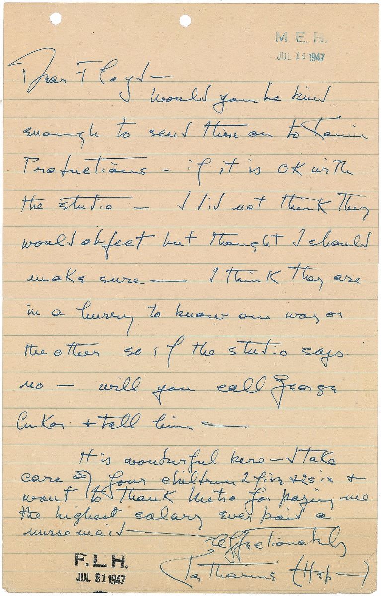 ALS signed “Katharine (Hep—),” one page, lightly-lined, 8 x 12.5, no date but postmarked July 11, 1947. Letter to MGM attorney Floyd Hendrickson, in full: “Would you be kind enough to send these on to [Garson] Kanin Productions—if it is OK with the studio—I did not think they would object but thought I should make sure—I think they are in a hurry to know one way or the other so if the studio says no—will you call George Cukor & tell him—It is wonderful here—I take care of four children, 2 five & 2 six & want to thank Metro for paying me the highest salary ever paid a nurse maid.” Accompanied by the original mailing envelope, addressed in Hepburn’s own hand. In fine condition, with punch holes to top edge.