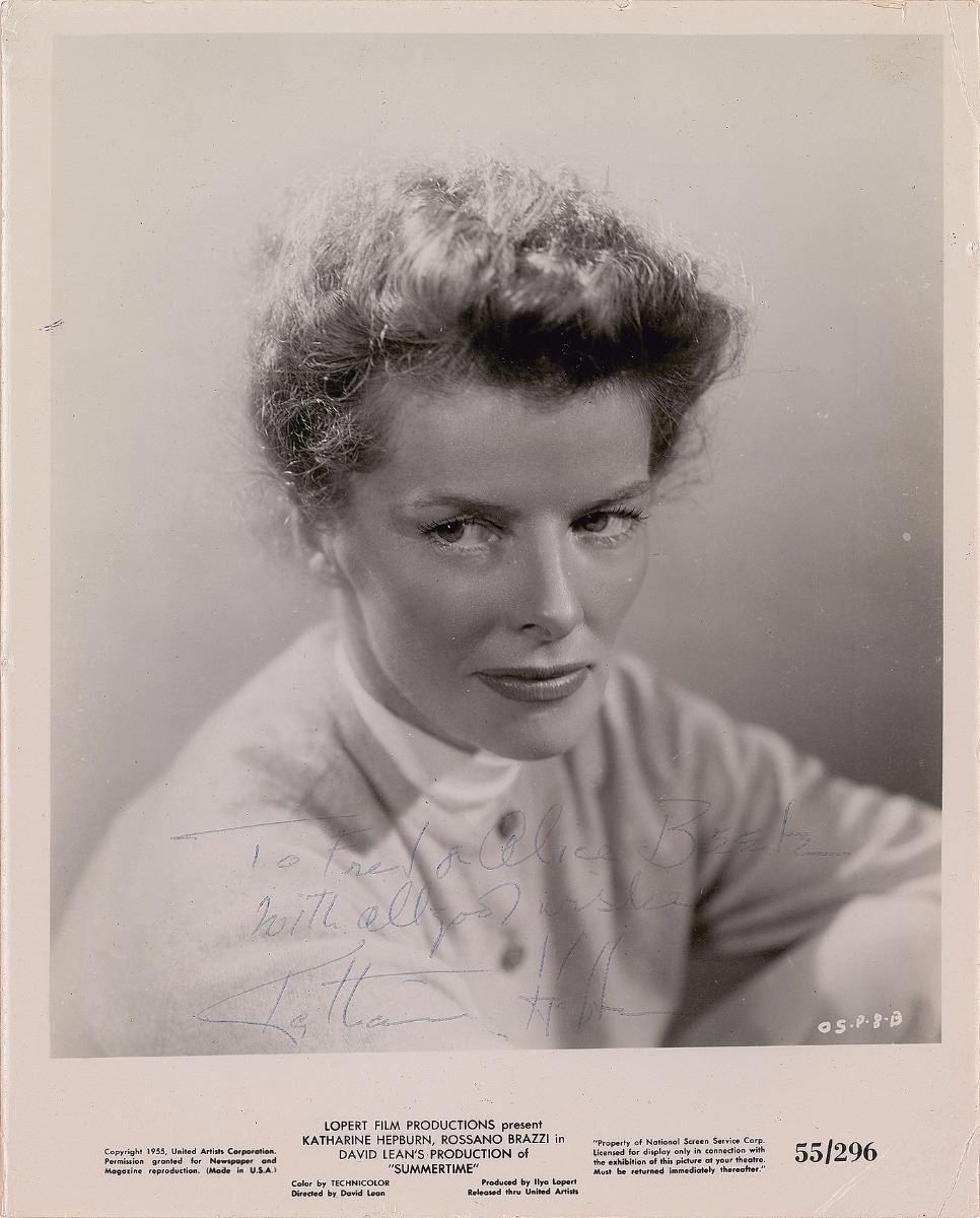 Glossy 8 x 10 United Artists publicity photo of Hepburn as Jane Hudson in the 1955 film Summertime, signed and inscribed in blue ballpoint, “To Fred & Alice Beetz, with all good wishes, Katherine Hepburn.” In very good to fine condition, with overall waviness and scattered creasing.