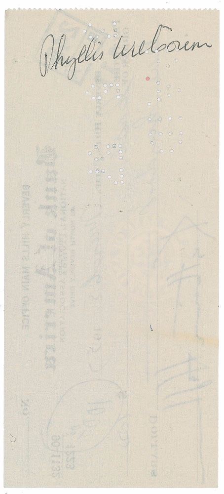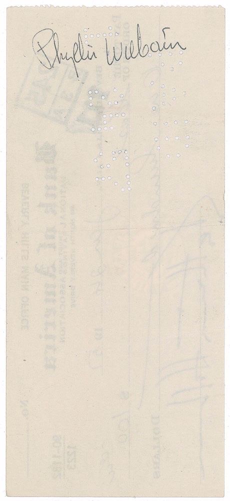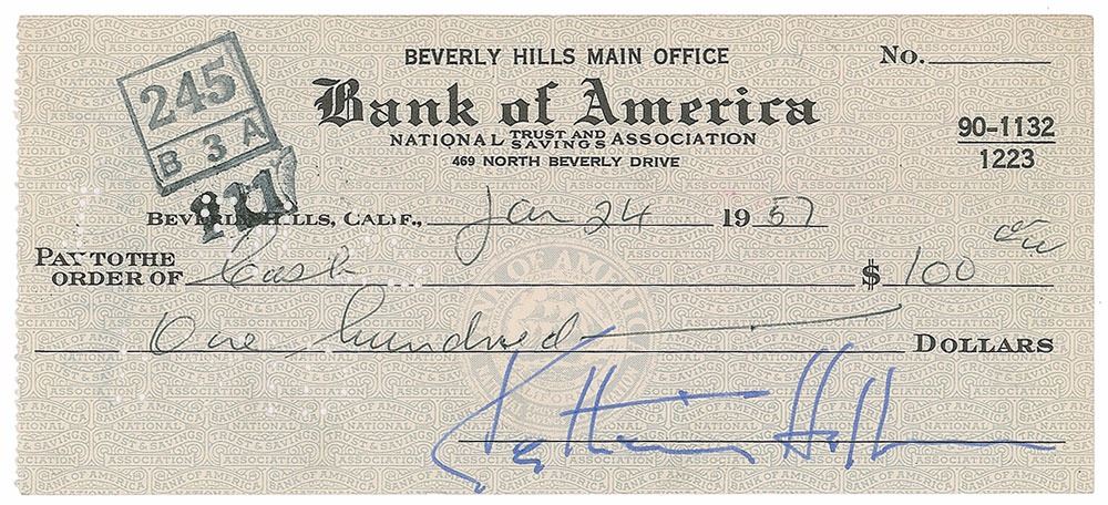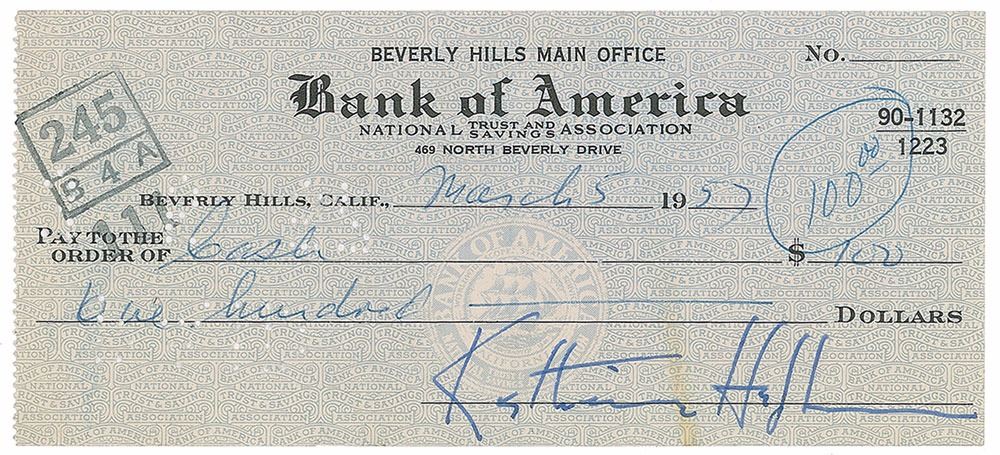 Two bank checks, 5.75 x 2.75, each filled out in another hand and signed by Hepburn, both payable to cash, January–March 1957. Both are endorsed on the reverse by her secretary-companion Phyllis Wilbourn. In overall fine condition.