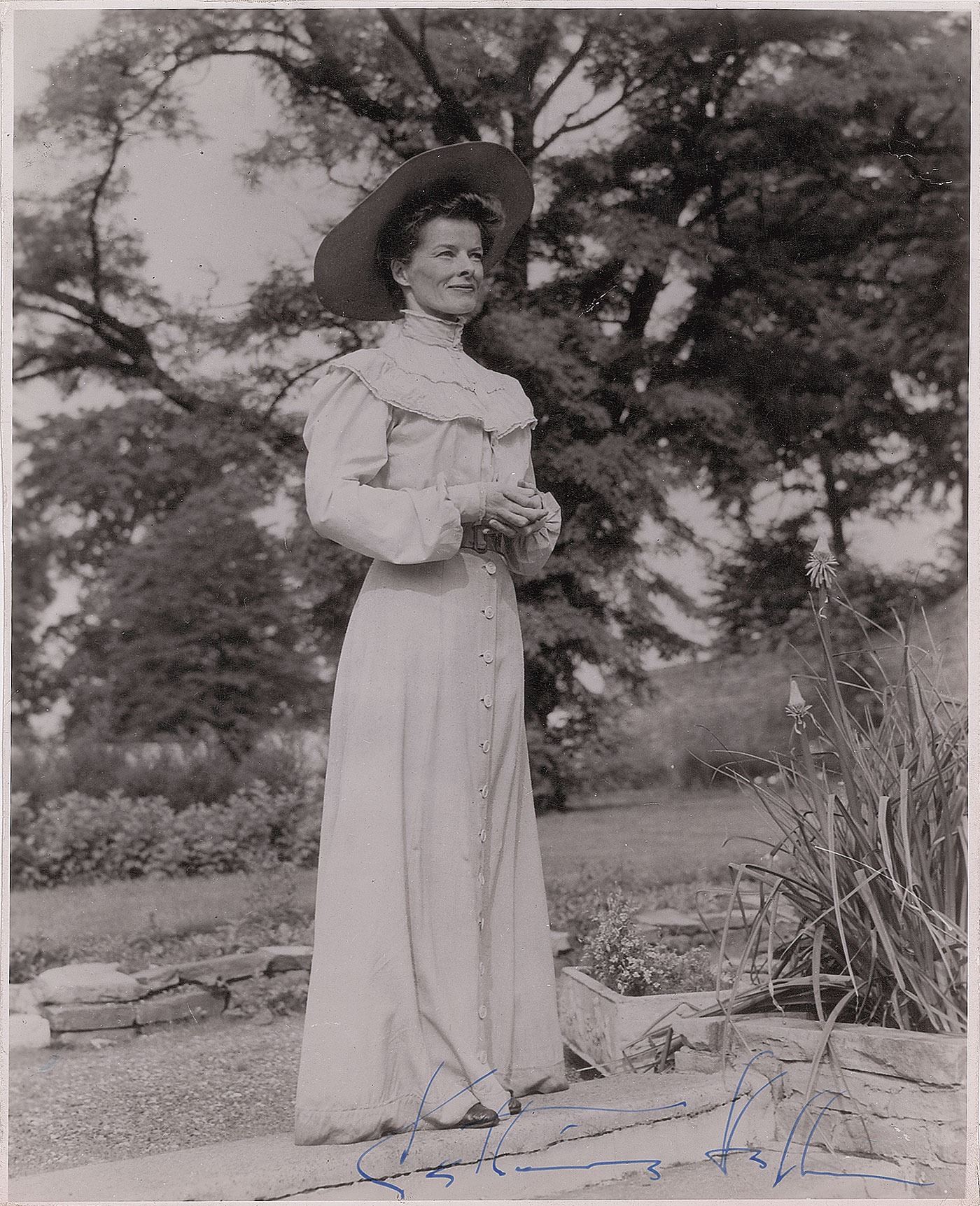 Vintage glossy 7.5 x 9.25 full-length photo of Hepburn as Rose Sayer from the 1951 film The African Queen, signed in blue fountain pen by Hepburn. In very good to fine condition, with scattered creasing and trimmed borders.