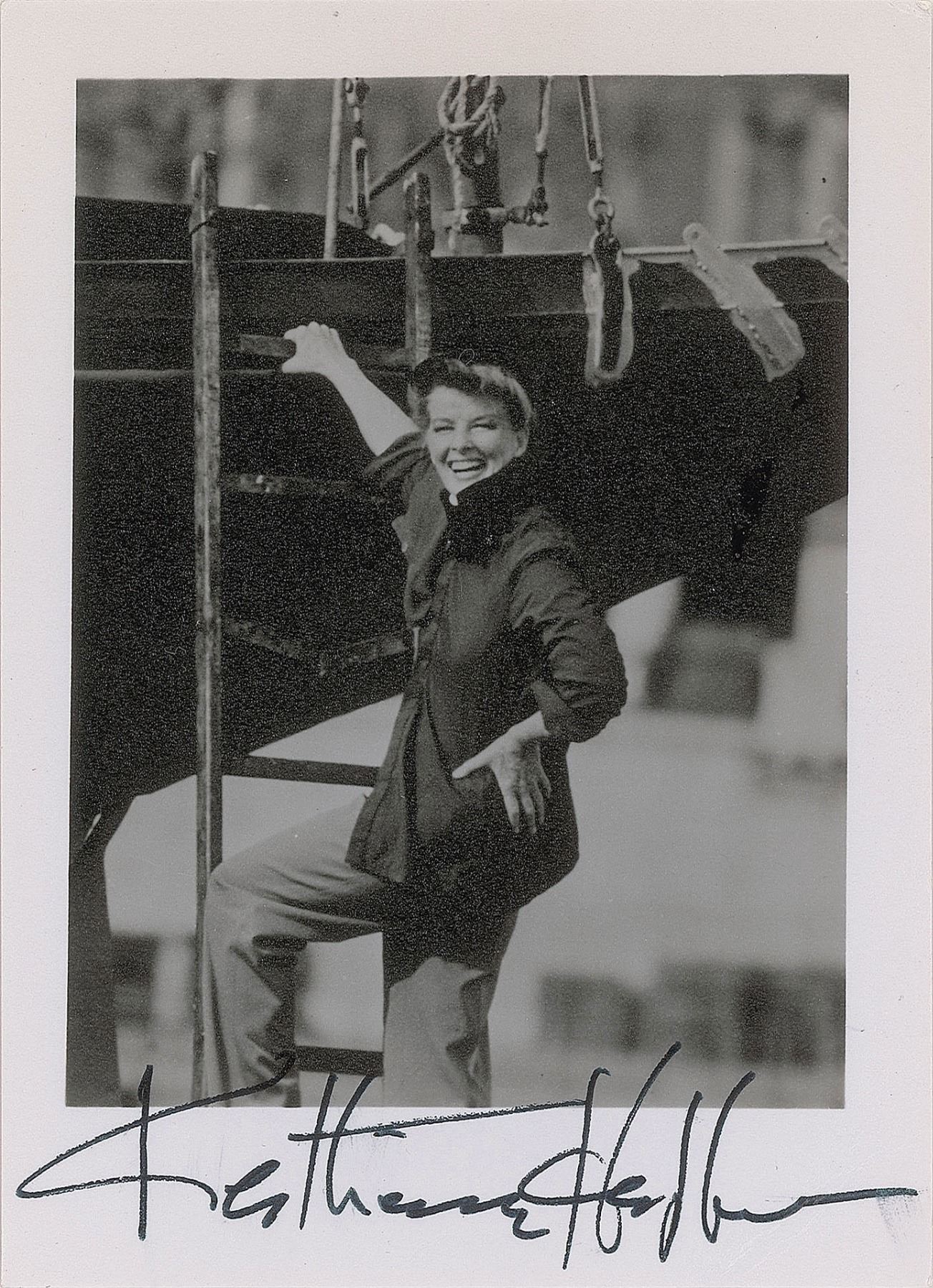 Uncommon matte-finish 3.5 x 5 photo of Hepburn on a ladder, signed in the lower border in black felt tip. In fine condition, with a crease to the lower right corner, and a small area of adhesive residue to the surface.