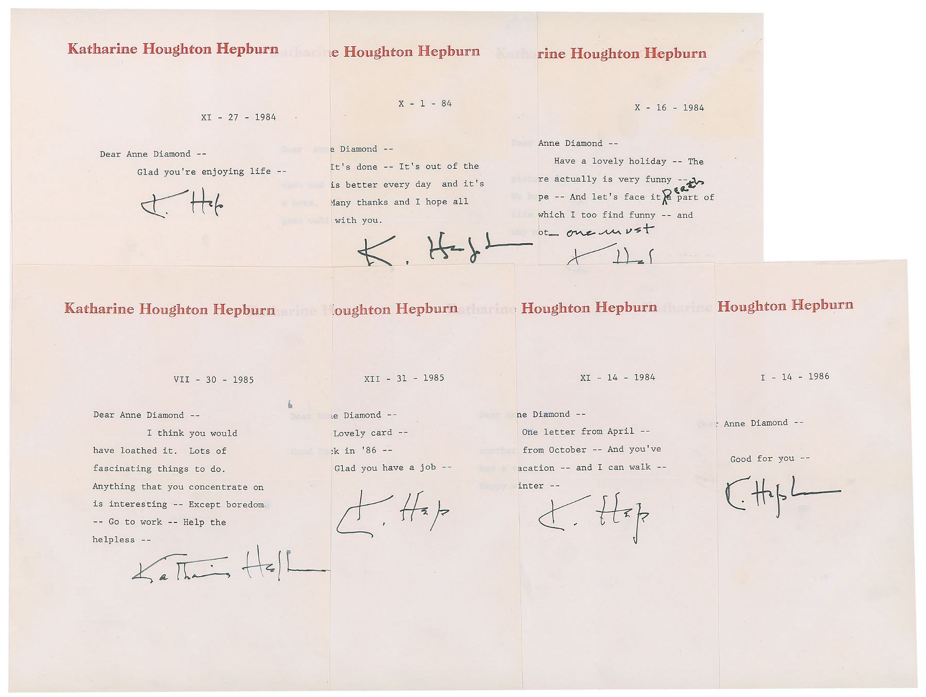 Group lot of seven TLSs, signed either “K. Hep,” “K. Hepburn,” or “Katharine Hepburn,” each one page, 6 x 8, personal letterhead, dated between 1984 and 1986. Each letter is addressed to Anne Diamond, with the bulk of subject matter consisting of brief pleasantries and messages of thanks. One letter, from October 16, 1984, in full: “Have a lovely holiday—The picture actually is very funny—We hope—And let’s face it Death [is] a part of life which I too find funny—and why not—one must,” with Hepburn adding a few words in her own hand. In overall fine condition. Accompanied by the original mailing envelopes.