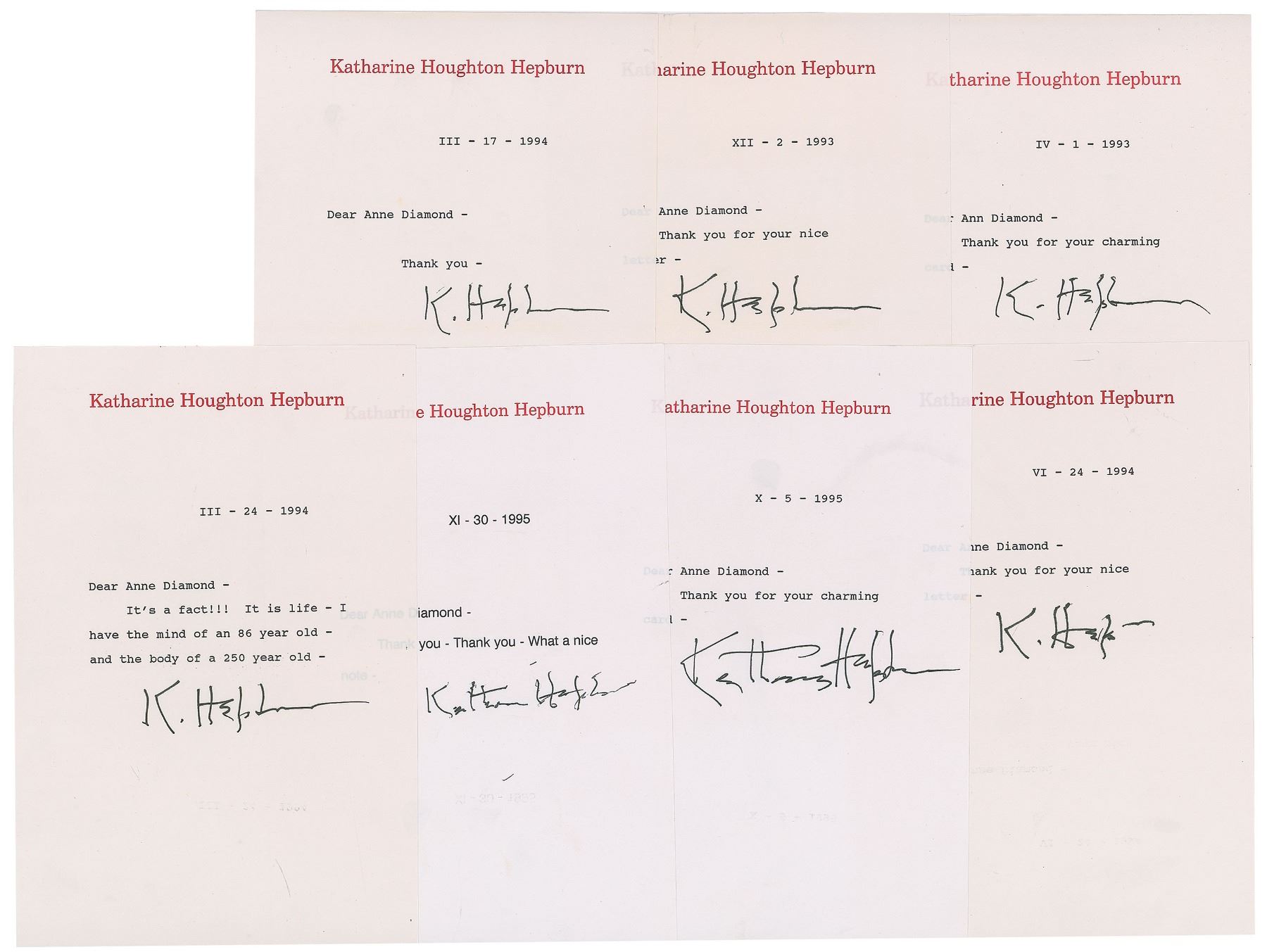 Group lot of seven TLSs, signed either “K. Hepburn” or “Katharine Hepburn,” each one page, 5.5 x 8.5, personal letterhead, dated between 1993 and 1995. Each letter is addressed to Anne Diamond, with the bulk of subject matter consisting of brief pleasantries and messages of thanks. One letter, from March 24, 1994, in full: “It’s a fact!!! It is life—I have the mind of an 86 year old—and the body of a 250 year old.” In overall fine condition. Accompanied by the original mailing envelopes, as well as by a group of 13 letters signed by Hepburn’s assistants.