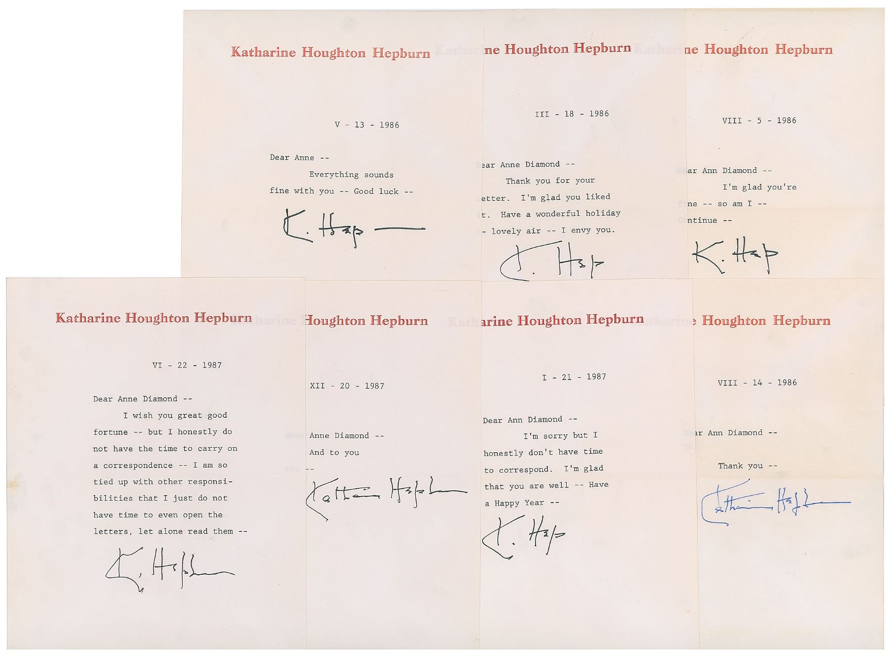 Group lot of seven TLSs, signed either “K. Hep,” “K. Hepburn,” or “Katharine Hepburn,” each one page, 6 x 8, personal letterhead, dated between 1986 and 1987. Each letter is addressed to Anne Diamond, with the bulk of the subject matter consisting of brief pleasantries and messages of thanks. One letter, from June 22, 1987, in full: “I wish you great good fortune—but I honestly do not have the time to carry on a correspondence—I am so tied up with other responsibilities that I just do not have time to even open the letters, let alone read them.” In overall fine condition. Accompanied by the original mailing envelopes.