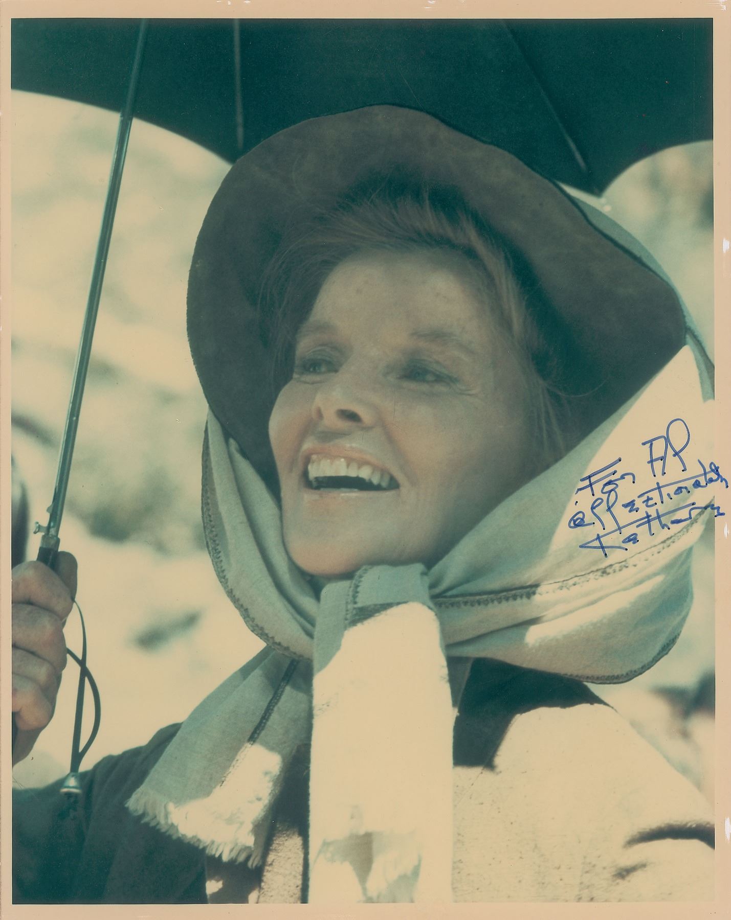 Color satin-finish 8 x 10 close-up photo of Katharine Hepburn as Miss Eula Goodnight in the 1975 Western film Rooster Cogburn, signed and inscribed in black felt tip, "For Al, Affectionately, Katharine.” In fine condition. The recipient of the photo is influential horse trainer and wrangler Al Yank, who worked with stars like John Wayne, James Dean, Elvis Presley, Clark Gable, and Lee Marvin.