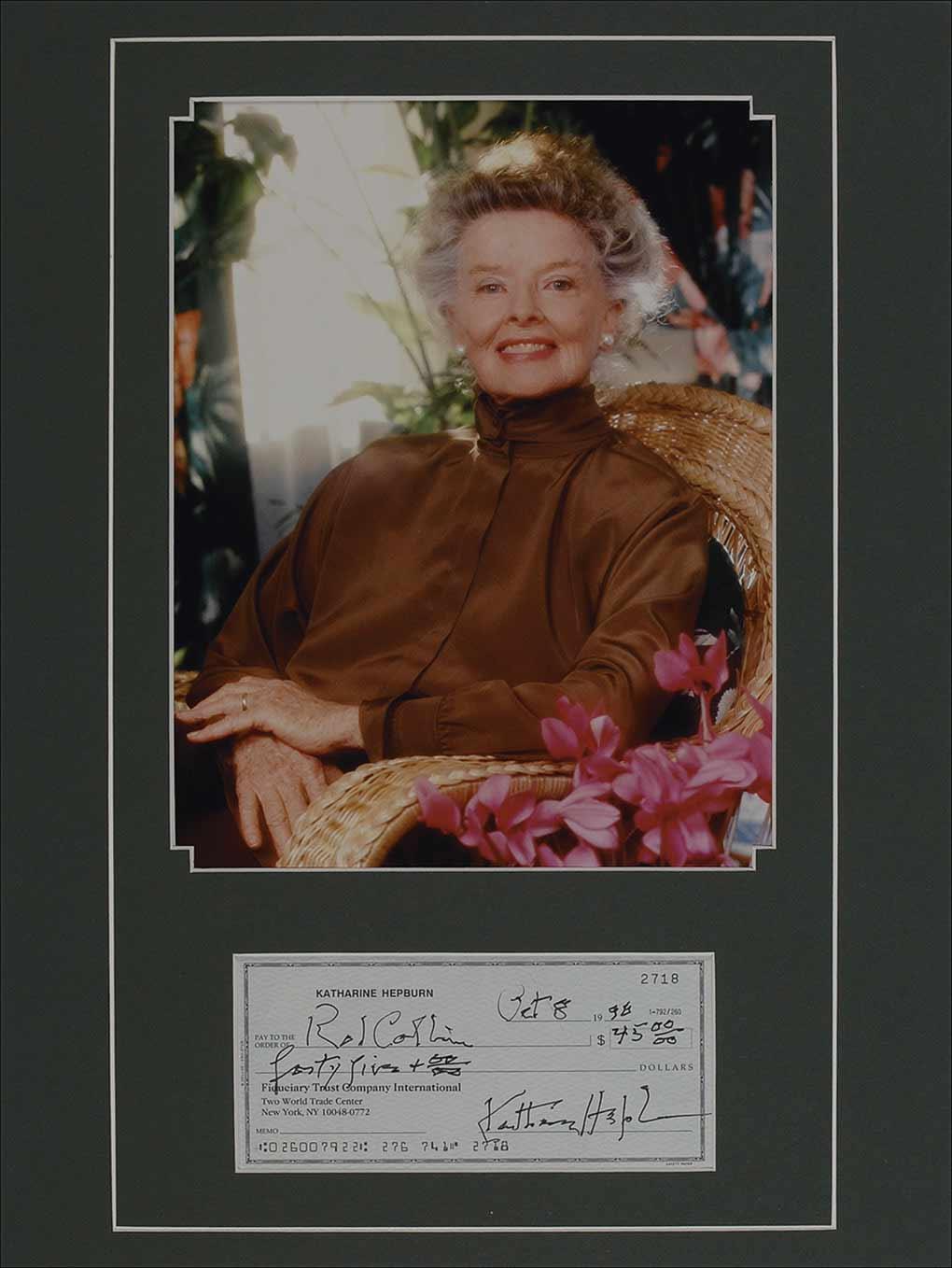Personal check, 6 x 2.75, filled out and signed by Hepburn, payable to Rod Colbin for $45.00, October 8, 1998. Matted with a color portrait of Hepburn, to an overall size of 12 x 16. In fine condition.