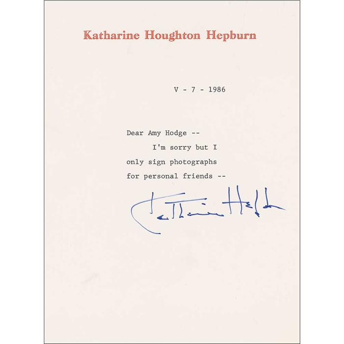 TLS, one page, 6 x 8, personal letterhead, May 7, 1986. Brief letter to a collector. In full: “I’m sorry but I only sign photographs for personal friends.” In fine condition, with light paperclip impression to top edge. Pre-certified PSA/DNA and RRAuction COA.