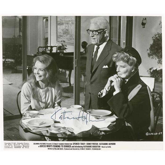 Uncommon glossy 9.25 x 7.75 photo, pictured with Spencer Tracy and her niece Katharine Houghton, from her AA-winning role from Guess Who’s Coming to Dinner, signed by Hepburn in black felt tip. In fine condition, with lightly trimmed edges, and a few scattered surface marks. Pre-certified PSA/DNA and RRAuction COA.