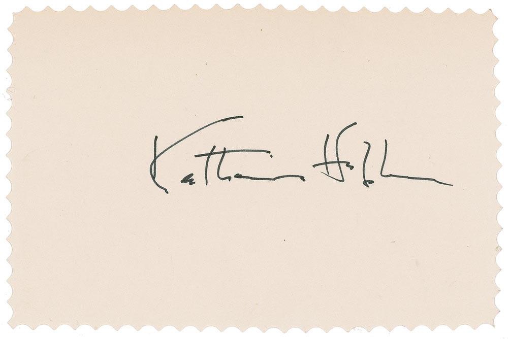 Felt tip signature, “Katharine Hepburn,” on an off-white 6 x 3.75 deckle-edge card. In fine condition. Pre-certified PSA/DNA and RRAuction COA.