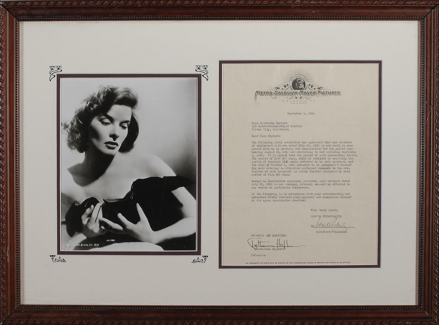 DS, one page, 8.5 x 11, September 1, 1942. An agreement between MGM and Hepburn in which Hepburn’s contract is suspended for a five-day period between August 29, 1942, and September 2, 1942. Signed at the conclusion in black ink by Hepburn. Double matted and framed with a lovely portrait of Hepburn, to an overall size of 22.5 x 17. In fine condition, with a couple of extra folds and creases. A rare document from the year that brought Spencer Tracy into Katharine Hepburn’s life and began their 27-year-long romance. Pre-certified PSA/DNA and RRAuction COA.