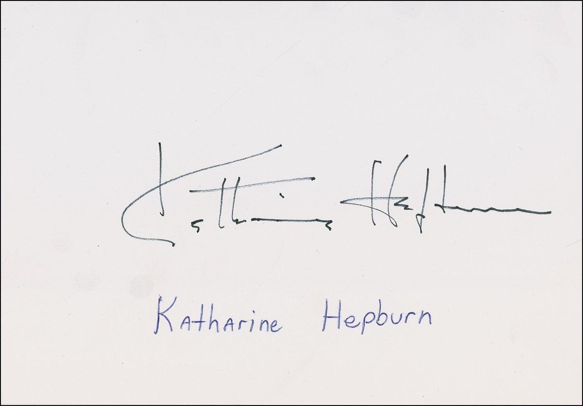 Felt tip signature, “Katharine Hepburn,” on a white 6.75 x 4.75 sheet. In fine condition, with central vertical fold and a collector notation written beneath her name, easily matted out if so desired. Pre-certified PSA/DNA and RRAuction COA.