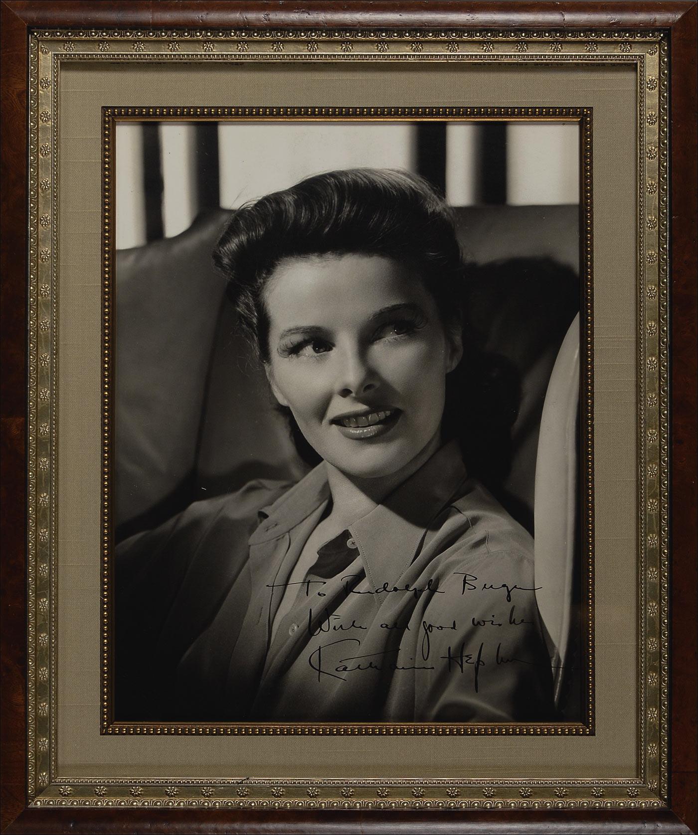 Lovely vintage matte-finish 9.25 x 12 head-and-shoulders photo of a young Hepburn in a chair, signed and inscribed in fountain pen “To Rudolph Burger, with all good wishes, Katharine Hepburn.” Cloth matted and framed to an overall size of 13.75 x 16.5. In fine condition, with creasing to lower left corner, and a few other small creases, including one to left of inscription.
