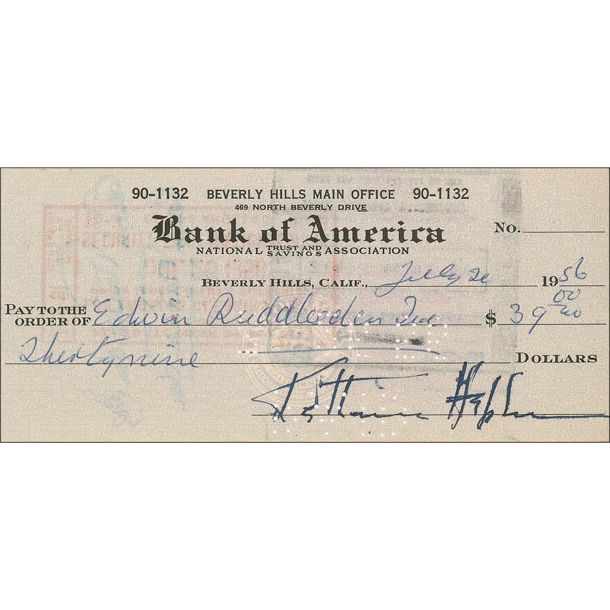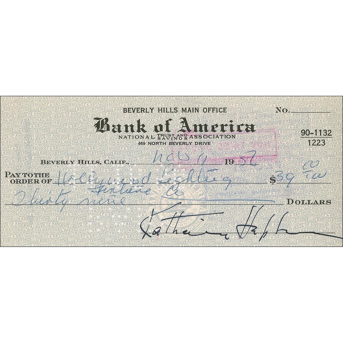 Two bank checks, both 6 x 2.75, both filled out in another hand and signed by Hepburn and dating from July and November of 1956. In very good to fine condition, with show-through from stamps on reverse of both checks, and cancellation holes over first name of one signature.