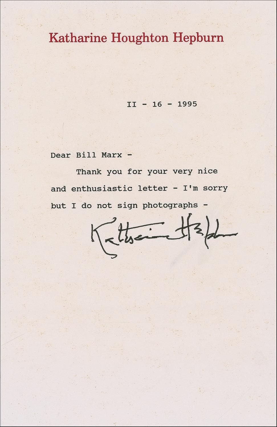 TLS, one page, 5.5 x 8.5, personal letterhead, February 16, 1995. Hepburn customarily declines an autograph request. In full: “Dear Bill Marx—Thank you for your very nice and enthusiastic letter. I’m very sorry but I do not sign photographs.” In fine condition.