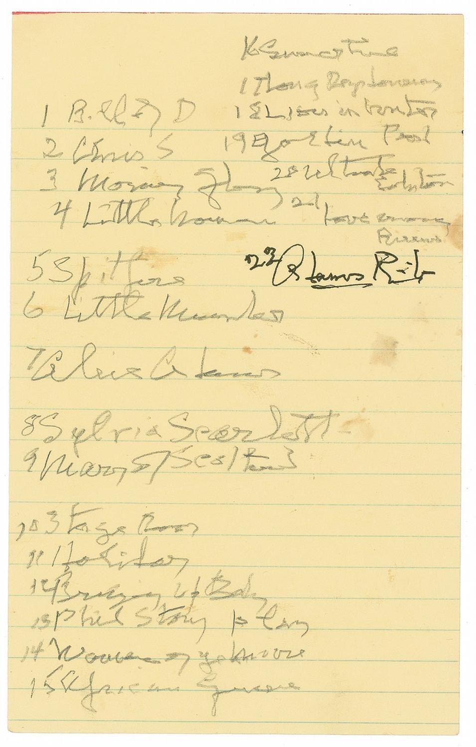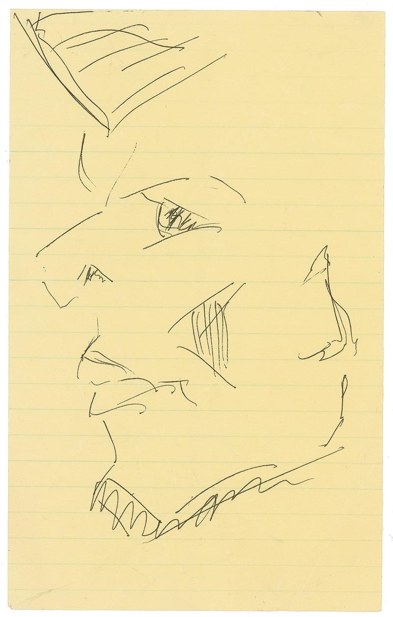 Two items: an unsigned handwritten list, mostly in pencil, on a yellow 5 x 8 lightly-lined sheet. Hepburn lists 22 of her films including: Bill of D[ivorcement], Chris S[trong] Little Women, Spitfire, Bringing Up Baby, Philadelphia Story, African Queen, and Adams Rib; and an original ballpoint self-portrait on an identical size lined page. In very good condition, with some scattered spotting and creasing to list, and overall creasing and wrinkling to sketch.