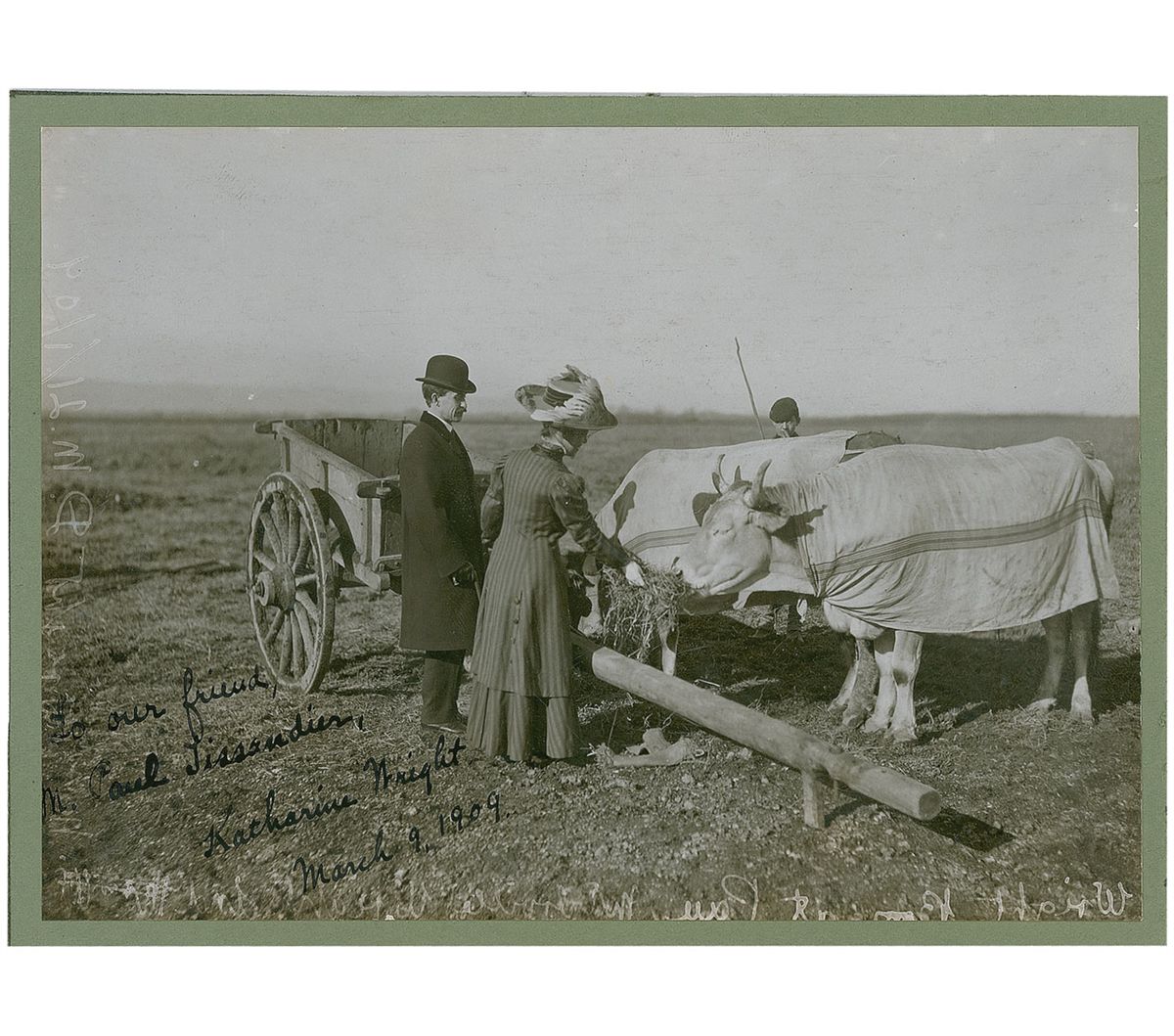 Rare vintage glossy 6 x 4.5 photo of Orville watching as Katharine feeds hay to a cow, affixed to a slightly larger cardstock mount, signed and inscribed in ink, “To our friend, M. Paul Tissandier, Katharine Wright, March 9, 1909.” In fine condition, with mild silvering to the darker areas of the image. Accompanied by two vintage pearl-finish photos, one of Katharine flanked by her sons during a day time stroll, and the other of Wilbur assisting Katharine in his plane.
