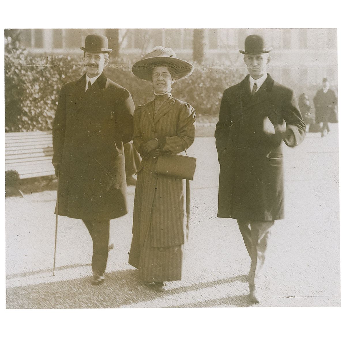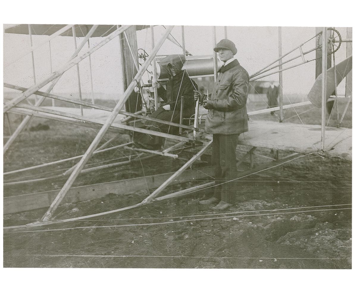 These photos of Katharine and her brothers were likely taken in Pau, France, where the Wrights flew between February and March 1909. Wilbur had asked Katharine to come to France with Orville, and they joined him in Pau; there, they became acquainted with M. Paul Tissandier, a French student pilot. Katharine was much more convivial and extroverted than her famously shy brothers, and quickly established herself in society. She became a magnet of the French press who saw in her the human dimension of the Wright story and circulated specious stories about her involvement in the invention of the Wright Flyer. Katharine, along with Wilbur and Orville, was awarded the Legion d’honneur, making her one of few women to have received the award. The Wrights returned to Dayton, Ohio, as celebrities. Katharine took on business responsibilities and later became an officer at the Wright Company after Wilbur’s death in 1912. A fine collection of photographs, and a seldom-seen signed photo of the Wrights’ sister.