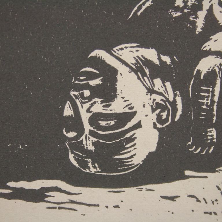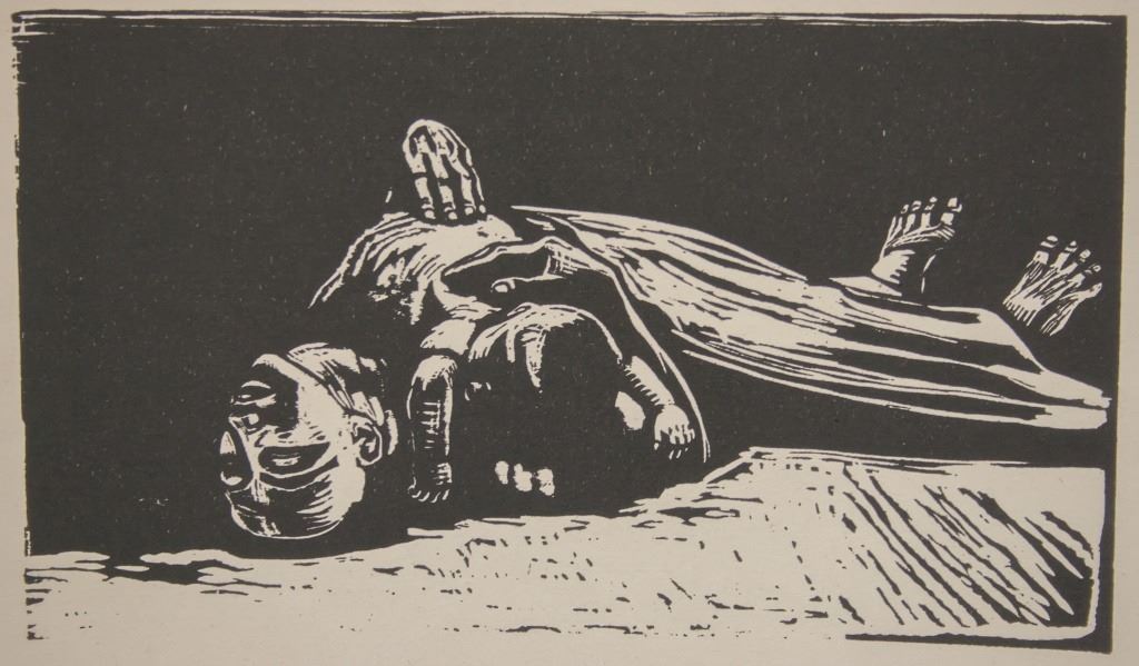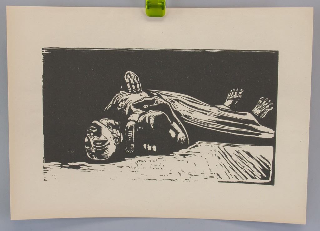 Etching on paper. Featuring a figure lying on the ground with neck arched up. Original titled "The Widow II" by Kathe Kollwitz. 26 x 36.5 cm (10.3 x 14.5 inch).