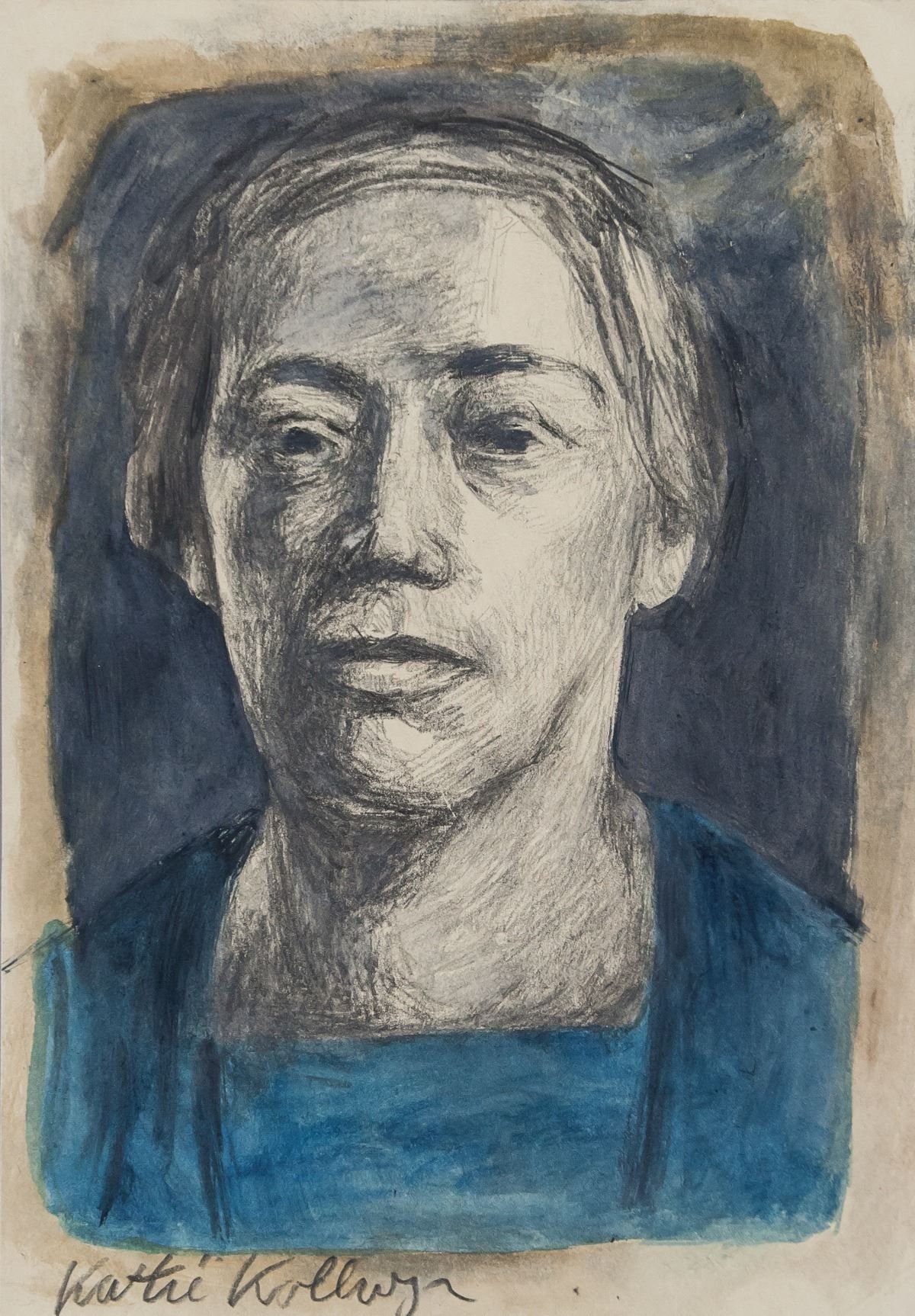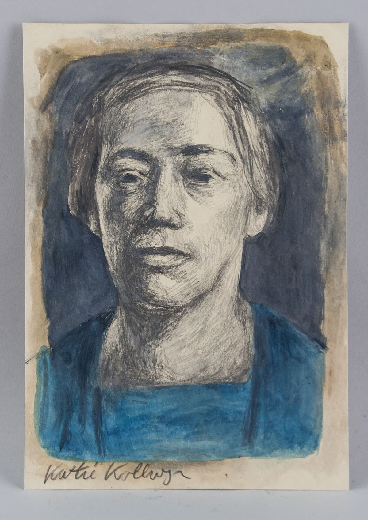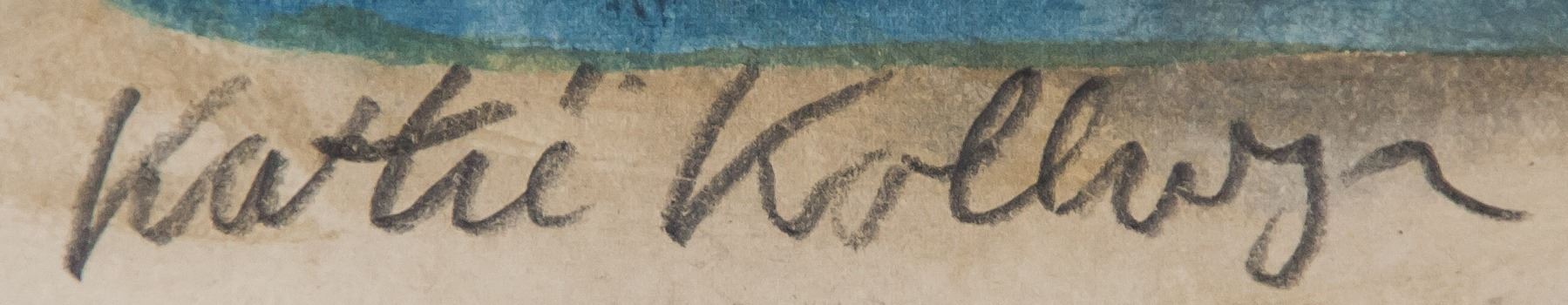 Mixed media on paper. Featuring a portrait. Signed Kathe Kollwitz on the lower left corner. Inscribed in pencil 215 on verso. Stamped Galerie un Auktionen AG on verso. Attributed to Kathe Kollwitz (1867-1945, German). 28 x 19.5 cm (11.0 x 7.7 inches). PROVENANCE: Southern Ontario estate