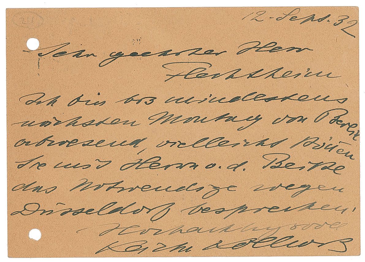 Important German artist (1867–1945) best known for her images of poverty and the effects of war. ALS in German, on a 5.75 x 4 postcard, September 12, 1932. Untranslated letter to famed German art dealer Alfred Flechtheim. In fine condition, with two punch holes to left edge.