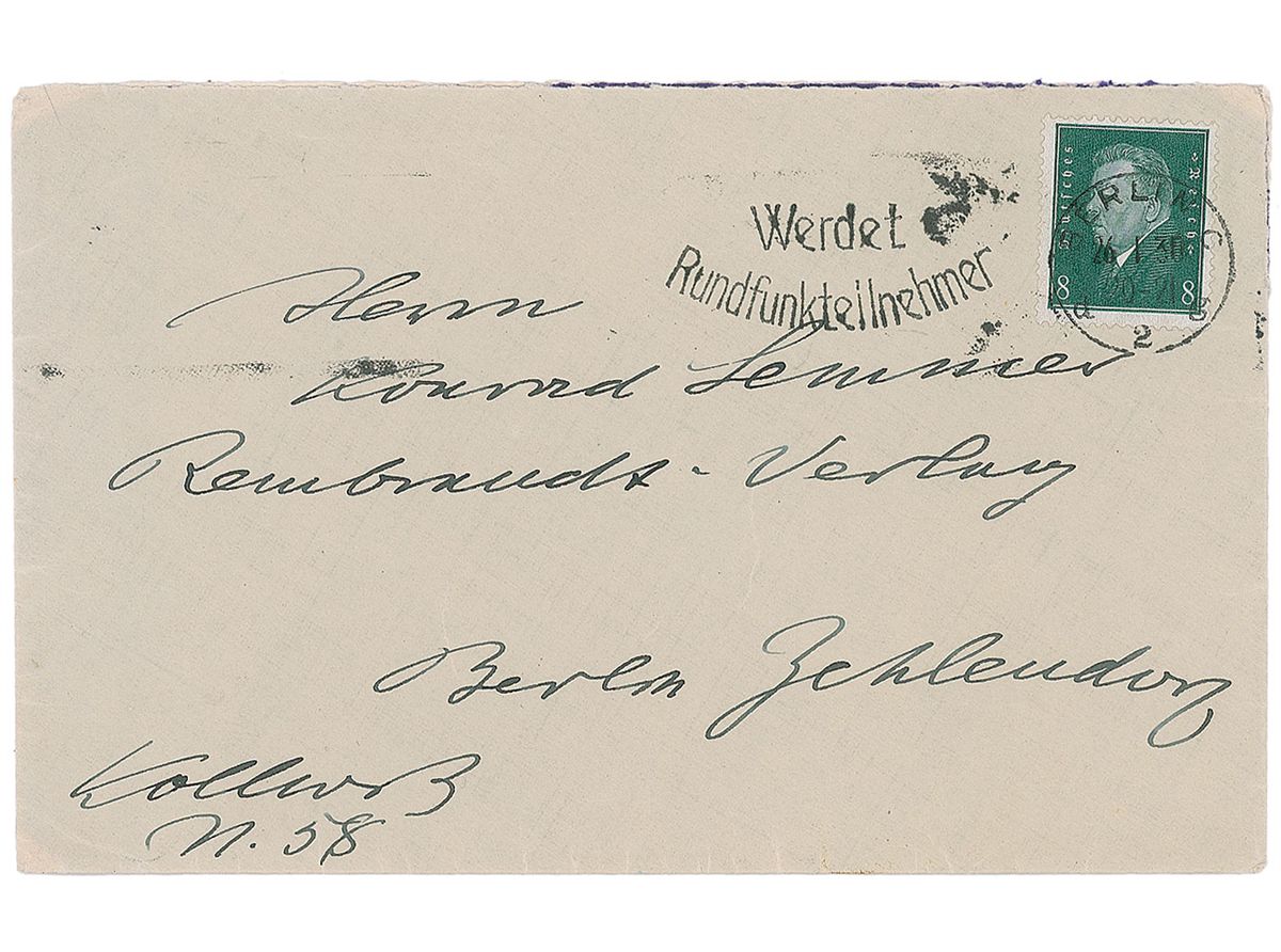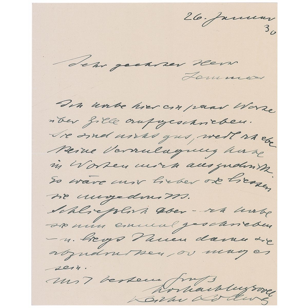 Important German artist (1867–1945) best known for her images of poverty and the effects of war. ALS in German, one page, 5.75 x 7, January 26, 1930. Letter to Konrad Lemmer of Rembrandt publishing company on her words about the artist Heinrich Zille for the a monograph by A. Heilborn. In part (translated): “They are not good, since I have no affection to express myself in writing. Eventually as I wrote them you have the permission to print it.” In fine condition. Accompanied by the original mailing envelope, addressed in her own hand.