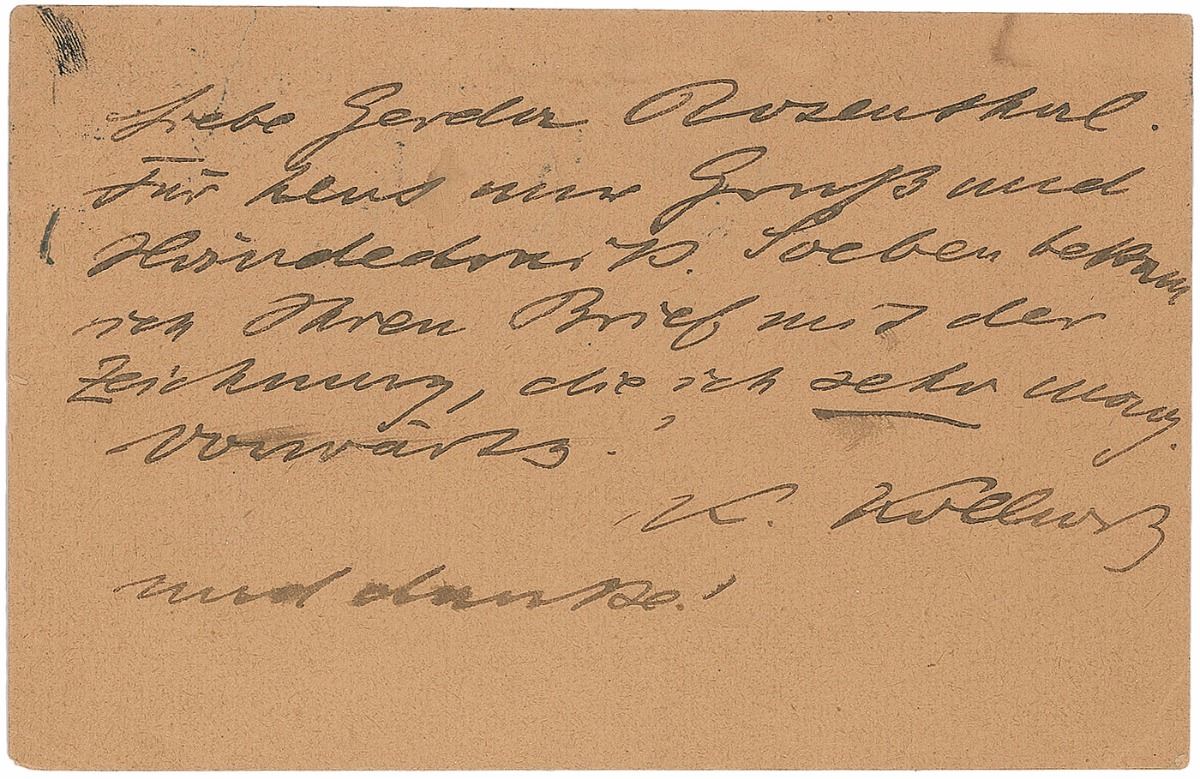 Important German artist (1867–1945) best known for her images of poverty and the effects of war. Untranslated ALS in German, signed “K. Kollwitz,” one page on a 5.75 x 3.75 postcard, postmarked January 25, 1922. A crease to the upper left, scattered soiling, and a few stray ink marks, otherwise fine condition.