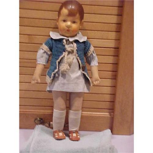 This Kathe Kruse is marked on her foot 83010 Kathe Kruse. This doll is a Kathe Kruse type 1 with a doll 1 head and a slender body. See Kathe Kruse I.D. Guide by Christa Xenidis. She is in good condition with just some soiling of her clothes and limbs. There are a few rubs in the back of her head but no crazing. The face could be cleaned but I will leave that to the new owner. Clothing is original. She is very pretty and a hard doll to find. Make an offer if not in an auction.