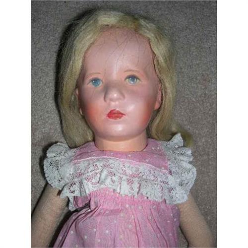This is a Kathe Kruse doll that was first made in 1929. She is 20 1/2" tall and is called a German Child Doll VIII. She has a wig that you can see has the tied knots into a piece of material and her head turns. The doll's right eye may have been touched up as it looks a little darker in color than the left eye.I just noticed it after looking under a strong light so she may have been touched up before I got her. Someone has tried to give her fingernail polish as she has a light pink on her fingers and more on her toes. There are some marks on her one foot but I don't see any Kathe Kruse signature. There are no holes or tears. There looks like a few water stains on the doll's right arm. One foot has a few stitched pulled out in the sole. Someone has put stitching on both legs up by the swivel as I guess material was starting to pull away from the seam. You don't see this when she is dressed but it's there. Her dress is cute but I'm sure is not original. She has on panties but again I don't think they are original. The socks are rayon and the shoes are older with the little metal pieces to put the ties through. They are old again but not original. She's been played with but is a nice example of a molded muslin painted head doll. If you can love her, please bid. Item is sold as is. She is from a smoke free environment. Buyer to pay $20 for U.S. shipping, handling, and insurance. Thanks for viewing.