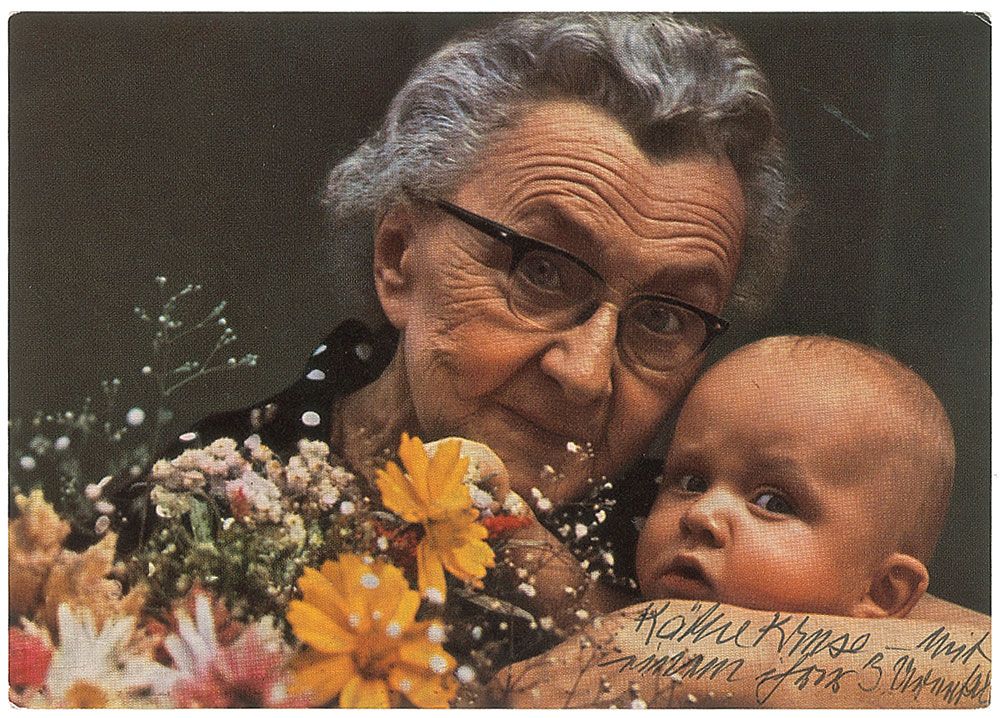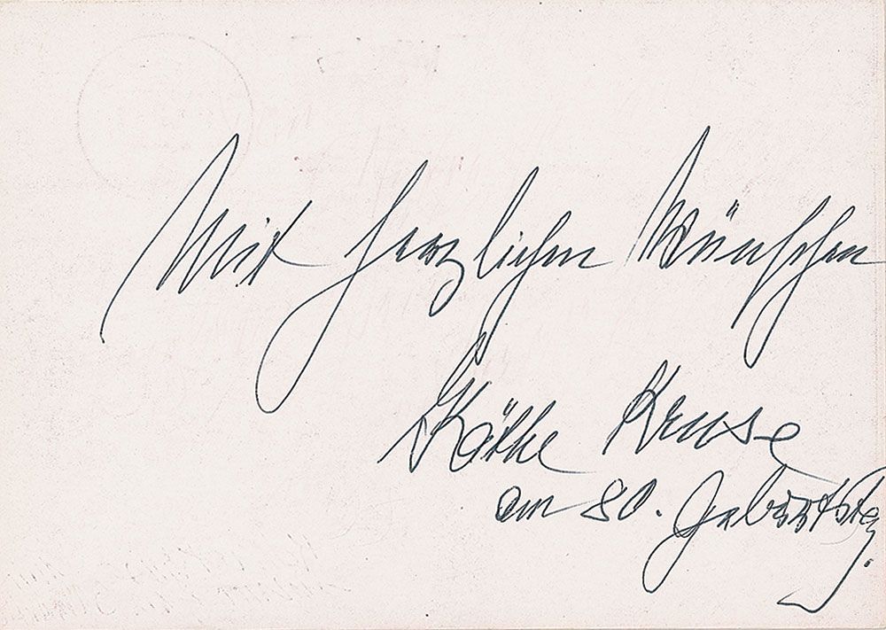 German doll designer. Color 6 x 4 cardstock photo, signed in black ballpoint, and also signed on the reverse, adding a sentiment regarding her 80th birthday. In fine condition, with surface impressions to image from writing on reverse.