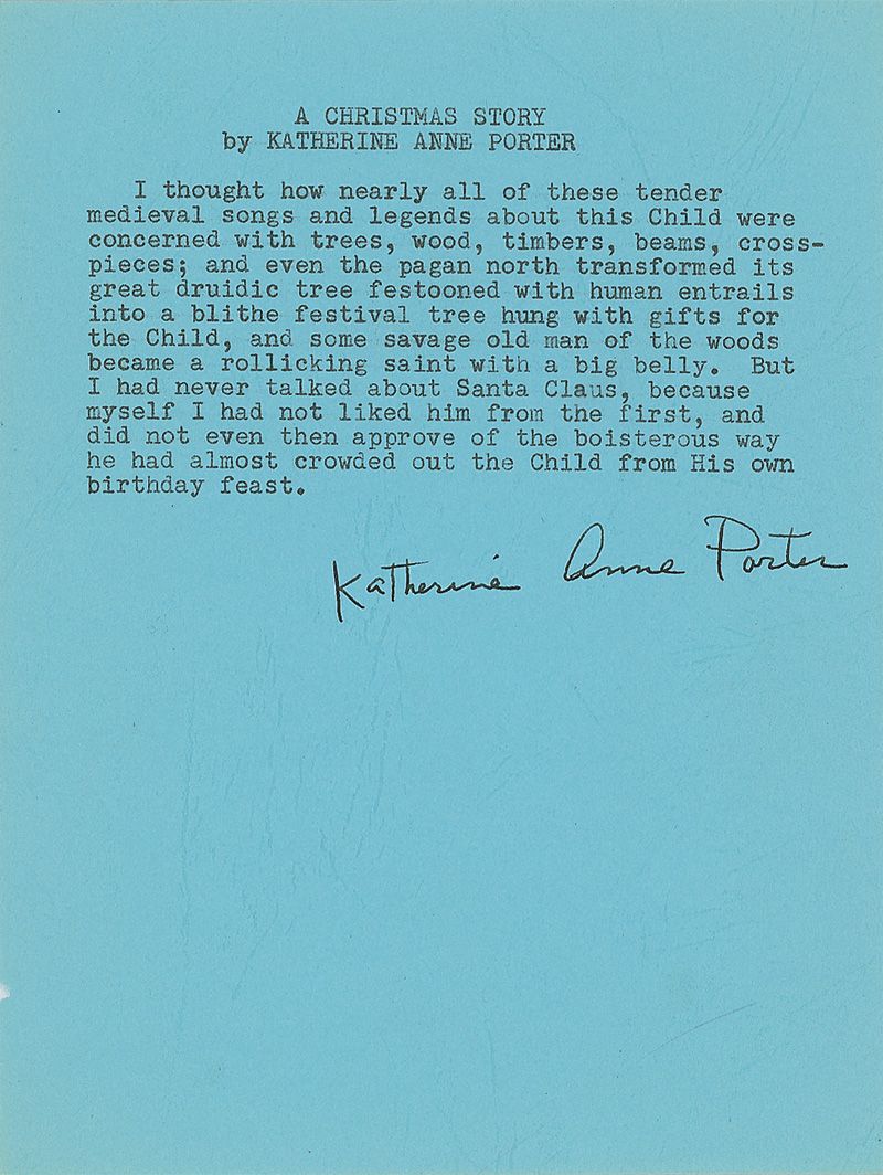 Pulitzer Prize–winning American writer (1890–1980) best known for such enduring stories as ‘The Jilting of Granny Weatherall’ and the novel Ship of Fools. Souvenir typescript, one page on a 6 x 8 cardstock sheet, from A Christmas Story, beginning: “I thought how nearly all of these tender medieval songs and legends about this Child were concerned with trees, wood, timbers, beams, crosspieces; and even the pagan north transformed its great druidic tree festooned with human entrails into a blithe festival tree hung with gifts for the Child, and some savage old man of the woods became a rollicking saint with a big belly.” Signed at the conclusion in black felt tip. In fine condition.