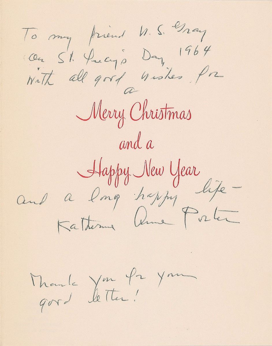 Pulitzer Prize–winning American writer (1890–1980) best known for such enduring stories as ‘The Jilting of Granny Weatherall’ and the novel Ship of Fools. Christmas card from 1964 featuring colorful holiday artwork on the front, measuring 5 x 6.5 closed, thoughtfully signed and inscribed inside in black ballpoint by Porter. In fine condition. Accompanied by the original mailing envelope addressed in her own hand, including her initials, “KAP,” in the return address on the flap.