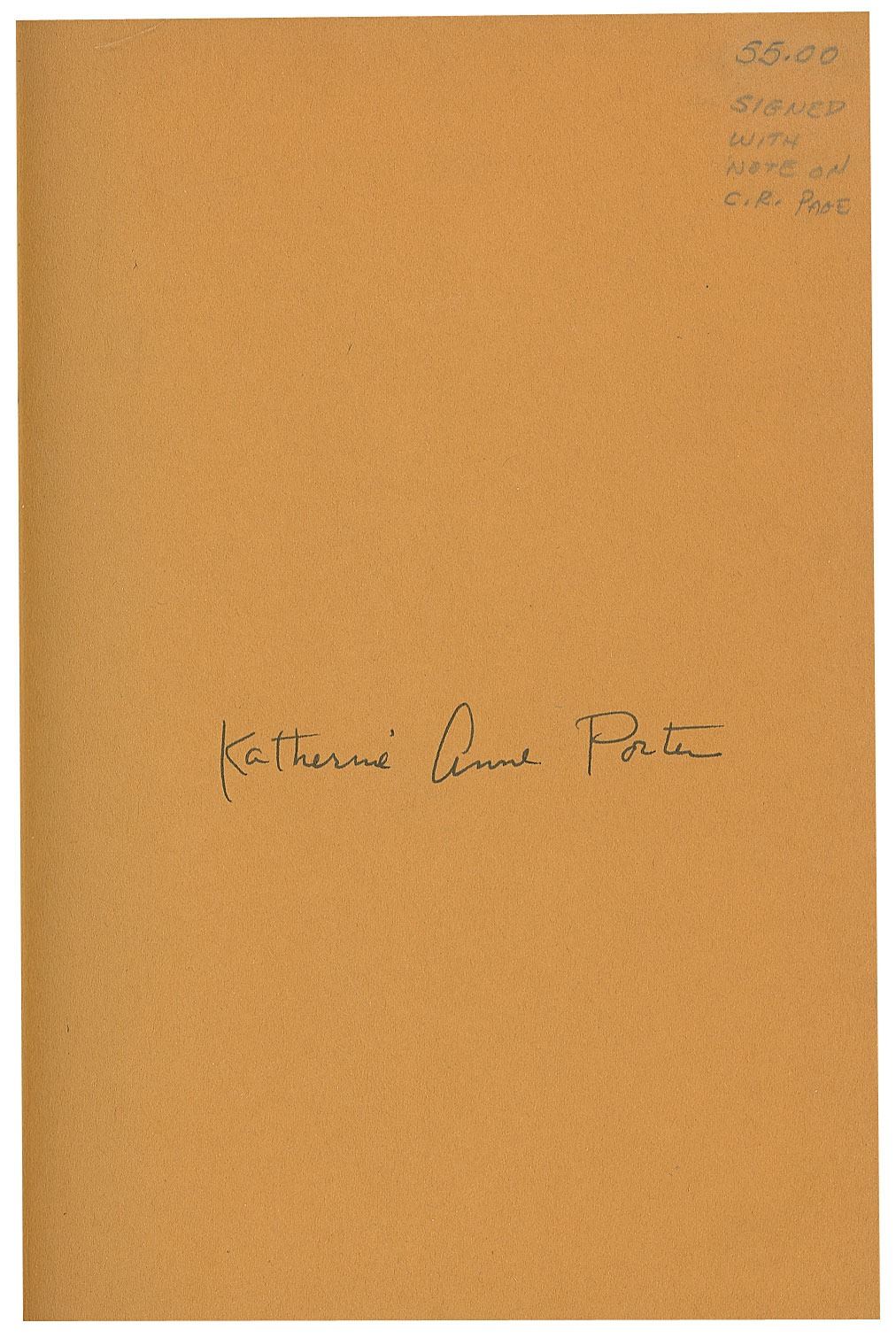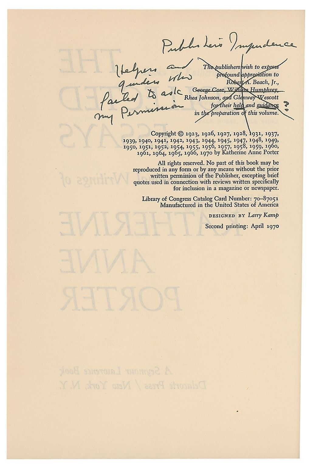 Signed book: The Collected Essays and Occasional Writings of Katherine Anne Porter. Second printing. NY: Delacorte Press, 1970. Hardcover with dust jacket, 6.5 x 9.25, 496 pages. Signed on the first free end page in black felt tip, "Katherine Anne Porter," with a handwritten note on the copyright page striking through the publisher's acknowledgments: "Publisher's Impudence, Helpers and guiders who failed to ask my permission." In fine condition.