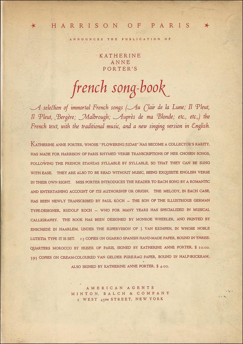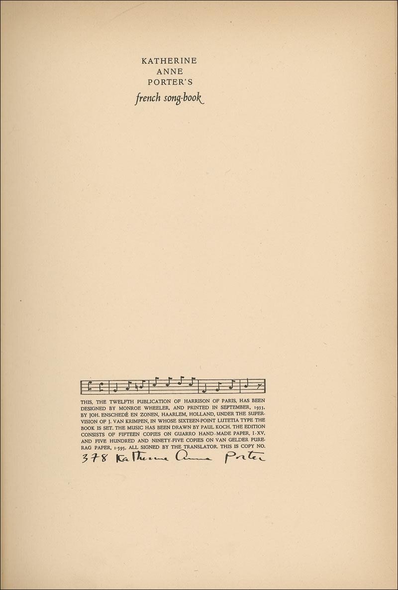 Pulitzer Prize–winning American writer (1890–1980) best known for such enduring stories as “The Jilting of Granny Weatherall” and the novel Ship of Fools. Signed book: French Song-Book. First edition, first printing. NY: Harrison of Paris, 1933. Hardcover with dustjacket, 8 x 11, 76 pages. Signed on the limitations page indicating this is a limited edition of 595 copies (this being #378). In fine condition, with mild toning to pages, as well as two small labels affixed to inside of front and back cover. Dustjacket has some mild toning and soiling, and a couple small edge tears. RRAuction COA.