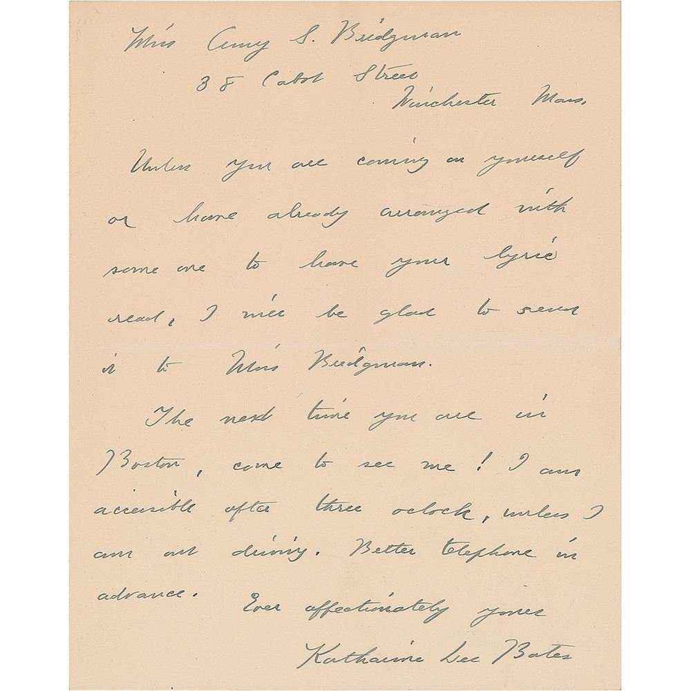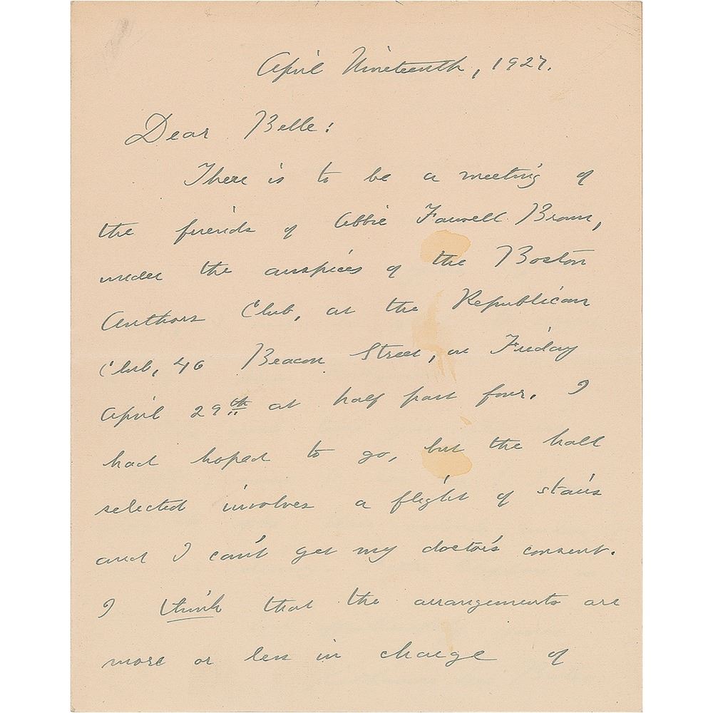 ALS, two pages on two adjoining sheets, 5.25 x 6.75, April 19, 1927. Letter to Belle, in part: "There is to be a meeting of the friends of Abbie Farwell Brown, under the auspices of the Boston Authors Club, at the Republican Club, 46 Beacon Street, on Friday April 29th at half past four. I had hoped to go, but the hall selected involves a flight of stairs and I can't get my doctor's consent. The next time you are in Boston, come to see me! I am accessible after three o'clock, unless I am out dining. Better telephone in advance." In fine condition, with a few light stains to the first page.