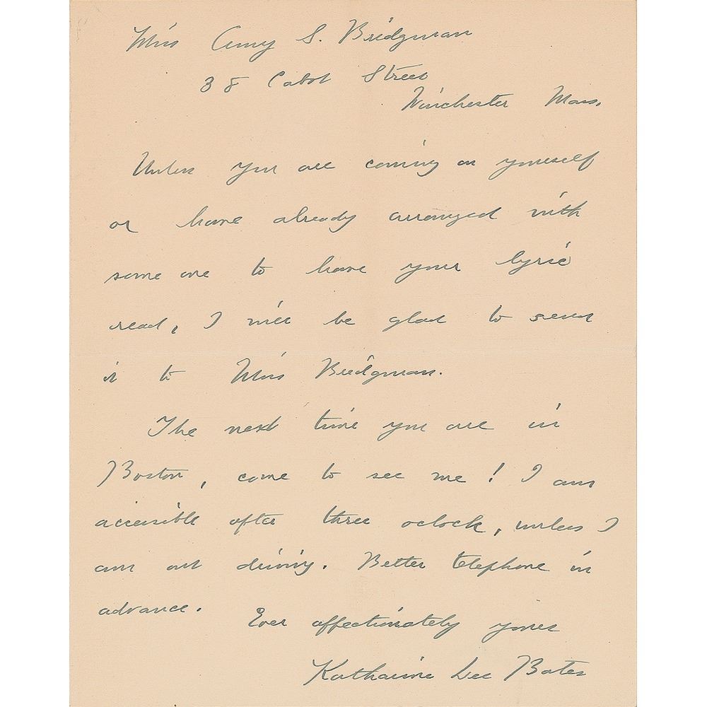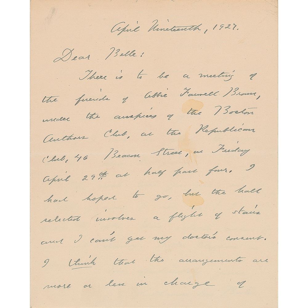 Educator and poet (1859-1929) best known for the lyrics to the iconic patriotic song "America the Beautiful." ALS, two pages on two adjoining sheets, 5.25 x 6.75, April 19, 1927. Letter to Belle, in part: "There is to be a meeting of the friends of Abbie Farwell Brown, under the auspices of the Boston Authors Club, at the Republican Club, 46 Beacon Street, on Friday April 29th at half past four. I had hoped to go, but the hall selected involves a flight of stairs and I can't get my doctor's consent. The next time you are in Boston, come to see me! I am accessible after three o'clock, unless I am out dining. Better telephone in advance." In fine condition, with a few light stains to the first page.