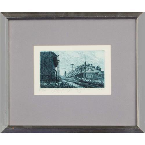 This is an attractive and well preserved etching. It is in excellent condition and is hand signed, numbered, and titled in pencil by the artist on the bottom. It is handsomely matted in a neutral gray mat and framed in a silver and black wood frame. The neutral colors of the mat and frame compliment the blue color of the etching. The total size of the piece is 11.25? x 13?.